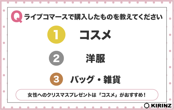「ライブコマースを見たことがある」と回答した人は30%に上り、「ライブコマースで買い物をしたことがある」人は約14%でした。購入した商品で最も多かったのが「コスメ」で、次に「洋服」「バッグ、雑貨」と続きました。