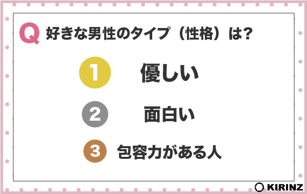 好きな男性の「性格」で最も人気を集めたのが「優しい人」でした。挙げられた理由として目立ったのが「人して基本だから」「喧嘩したくないから」「他の人にも優しい人がいいから」といった意見でした。