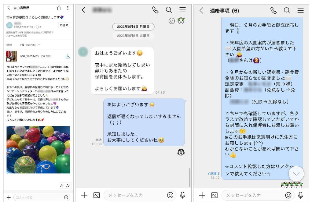 中央: 園児の欠席連絡をチャットで受け付けし、速やかに把握