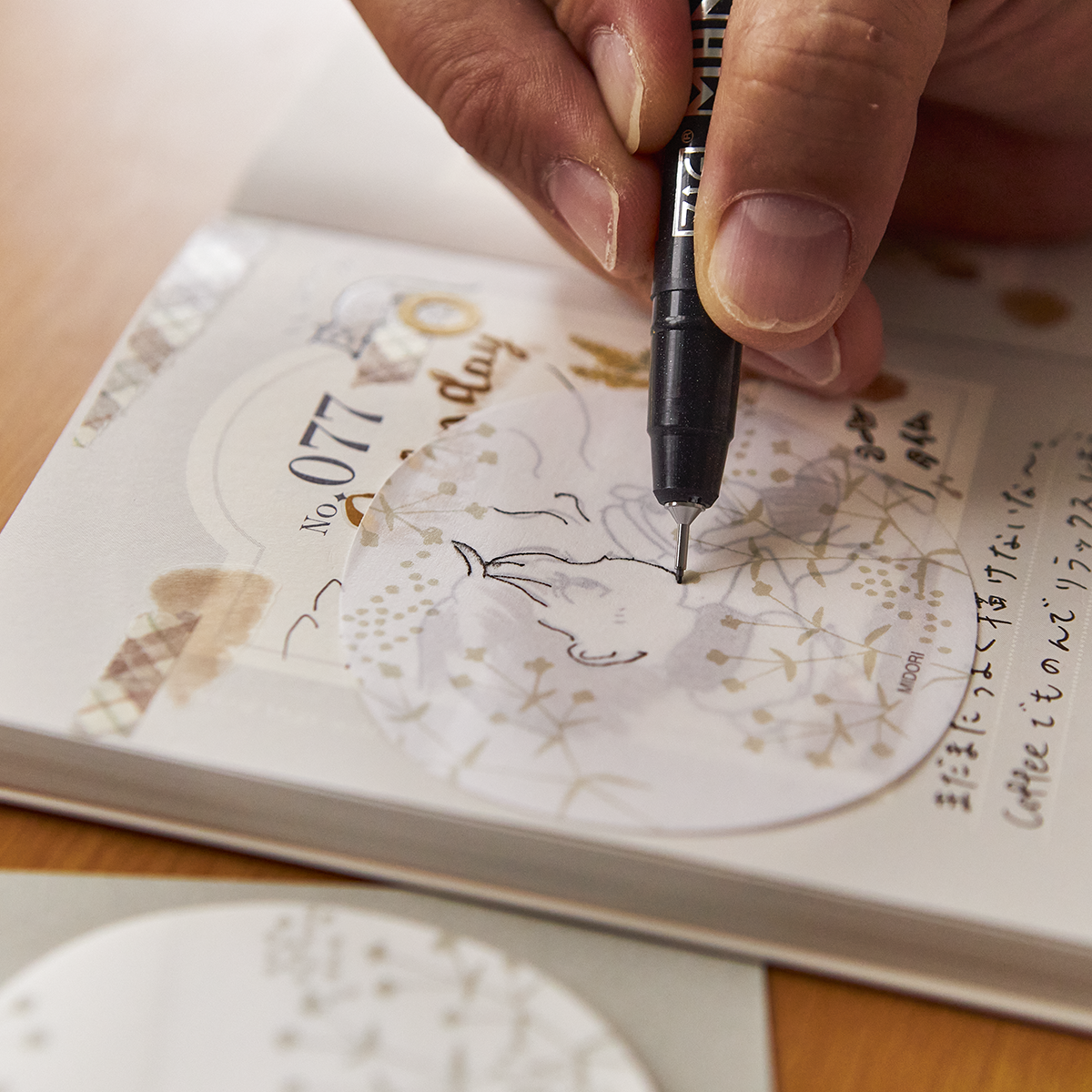 トレーシングペーパーとしても使用できる「透けるふせん」を使い、鉛筆でふせんに描いたイラストを紙にこすりつけて転写します。その線を同封の漫画ペンでなぞり、マイルドライナーで色付けすることで、簡単にイラストを描くことができます。