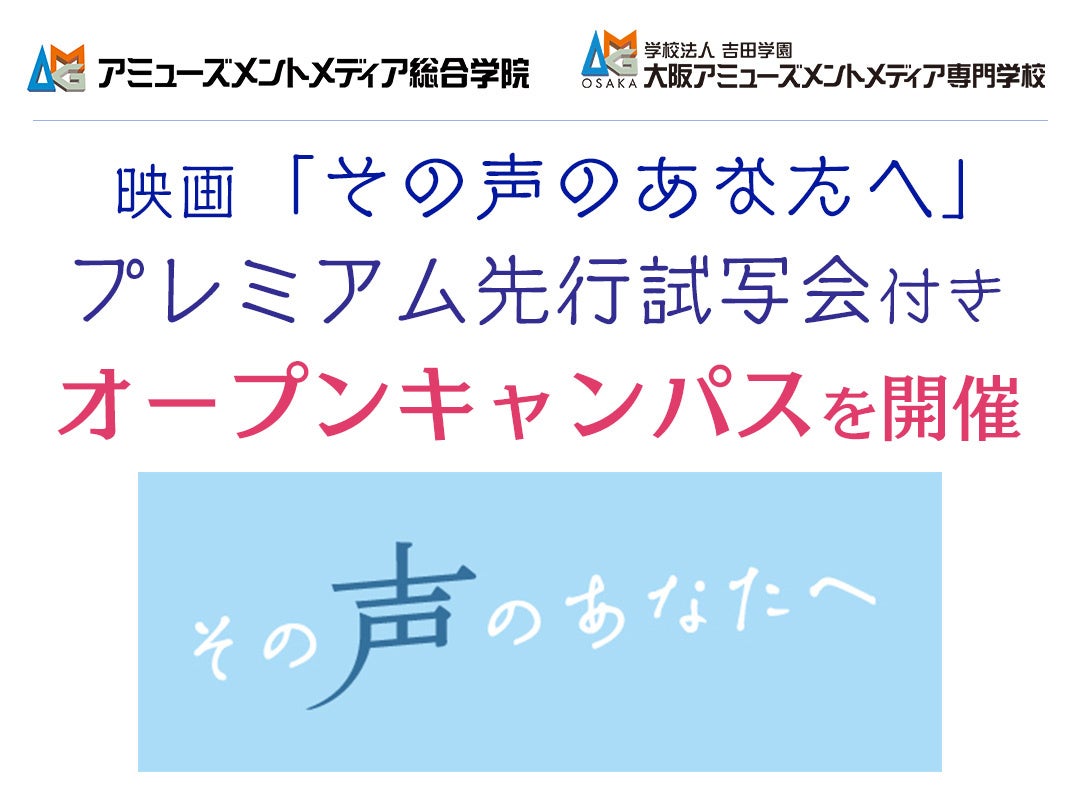 また、本作の公開を記念して、声優業界への進路をご検討中の方を対象にしたAMGだけのプレミアム先行試写会付きオープンキャンパスを東京・大阪各校で開催します。