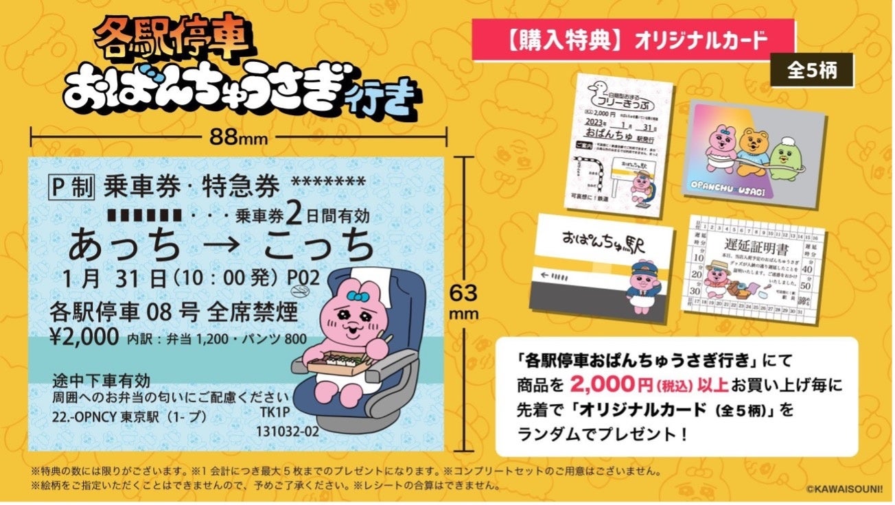 イラストレーター「可哀想に!」さんによる人気キャラクター「おぱんちゅうさぎ」のポップアップストア「各駅停車おぱんちゅうさぎ行き」が期間限定で開催!”おぱんちゅうさぎ”と”駅”や”電車”にちなんだコラボイラストは本イベントのためだけの描きおろし!その描き下ろしイラストを使用したイベント限定商品を中心にたくさんのアイテムをご用意しております。来るの?来ないの?みなさまのご来店をお待ちしております。
