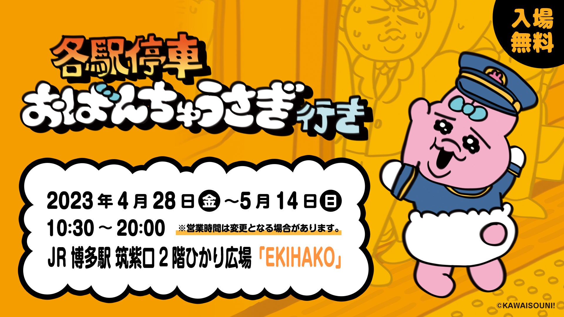 オリジナル商品の企画・制作・販売を軸に、企業・組織のトータルブランディングを手掛ける株式会社ヘソプロダクション(本社:大阪市福島区・代表取締役:稲本ミノル)は、おぱんちゅうさぎのポップアップストア「各駅停車おぱんちゅうさぎ行き」を、2023年4月28日(金)から5月14日(日)までの間、JR 博多駅 筑紫口2階 ひかり広場「EKIHAKO(エキハコ)」にて期間限定開催いたします。