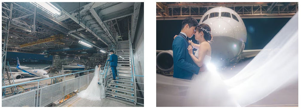 「ANA Blue Hangar Wedding Photo」に、これまでにご参加いただいたお客様からは、「航空機の格納庫に立ち入り、航空機の横で写真を撮るというのは非常に貴重な機会で、これはどんな屋外ロケーション撮影よりも珍しく一生の思い出になった。」「スタッフ皆様のご協力により、目的の一つであった妻へのサプライズプレゼントも達成でき、私共の人生での貴重な1ページを記すことができました。一般には体験することができないロケーションでの撮影やサービスも最高でした。」と嬉しいお声をいただいております。今回も特別な場所での記念に残る思い出と体験をお届けします。