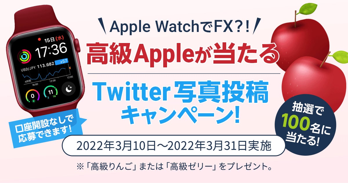 GMOインターネットグループのGMOフィナンシャルホールディングス株式会社の連結会社で、金融商品取引業を営むGMOクリック証券株式会社(本社:東京都渋谷区、代表取締役社長:鬼頭 弘泰、以下:当社)は、FXネオ取引専用スマートフォンアプリ 「GMOクリック FXneo」が2021年12月にApple Watchでも一部機能が利用できるようになったことを記念し、2022年3月10日(木)より、「Apple WatchでFX?!高級Appleが当たる、Twitter写真投稿キャンペーン」を開始いたします。