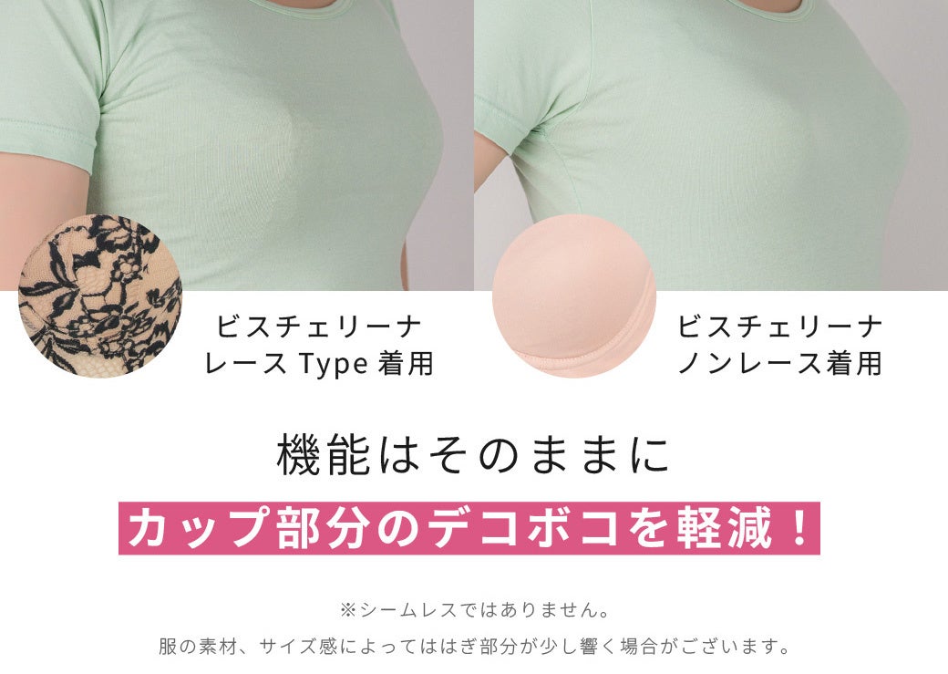 「ビスチェリーナ ノンレース」は大人気商品の「ビスチェリーナ」の機能はそのままでカップは立体カップで表面をツルッと響きにくい仕様のため、服を着たときのボコボコを軽減します。