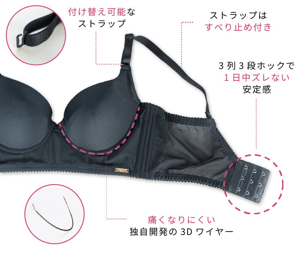 ワイヤーは独自開発の3Dワイヤーを使用しているため、体にカーブに沿いやすく痛くなりにくくなっています。3列3段ホックで安定感もバツグン。