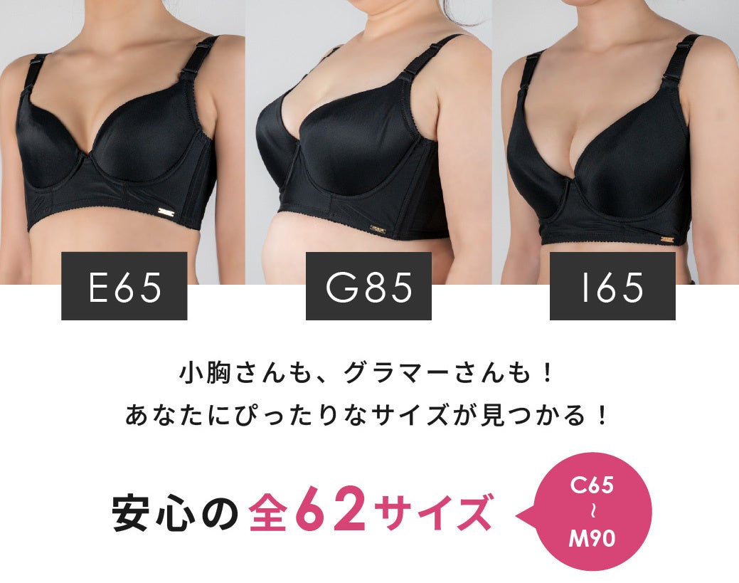 下着はサイズが合ってこそ、本来の心地よさや機能を実感できるもの。C65〜M90までの全62サイズ展開で、小胸さんからグラマーさんまで、幅広い体型の方に安心してお選びいただけます。