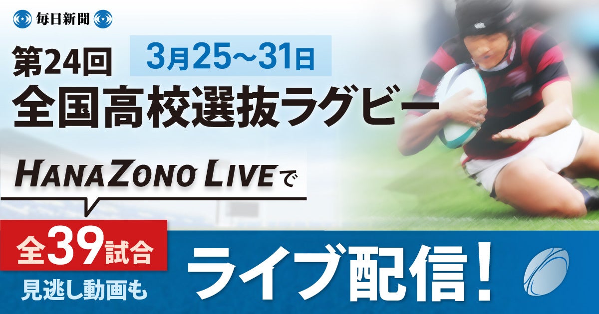 毎日新聞社は、埼玉県熊谷市の熊谷文化スポーツ公園ラグビー場で3月25日(土)から始まる、第24回全国高等学校選抜ラグビーフットボール大会(日本ラグビーフットボール協会主催、毎日新聞社など後援)を全39試合、無料でライブ配信します。熱闘の様子をご覧いただけるのは、全国高校ラグビー大会や全国高校7人制ラグビー大会も配信する高校ラグビー公式サイト「HANAZONO LIVE」(https://www.mbs.jp/rugby/)。準々決勝からは実況と解説付きで、試合後は無料で見逃し動画も配信します。1、2年生の新チームが挑む最初の全国大会。今シーズンを占う熱闘をぜひご覧ください。