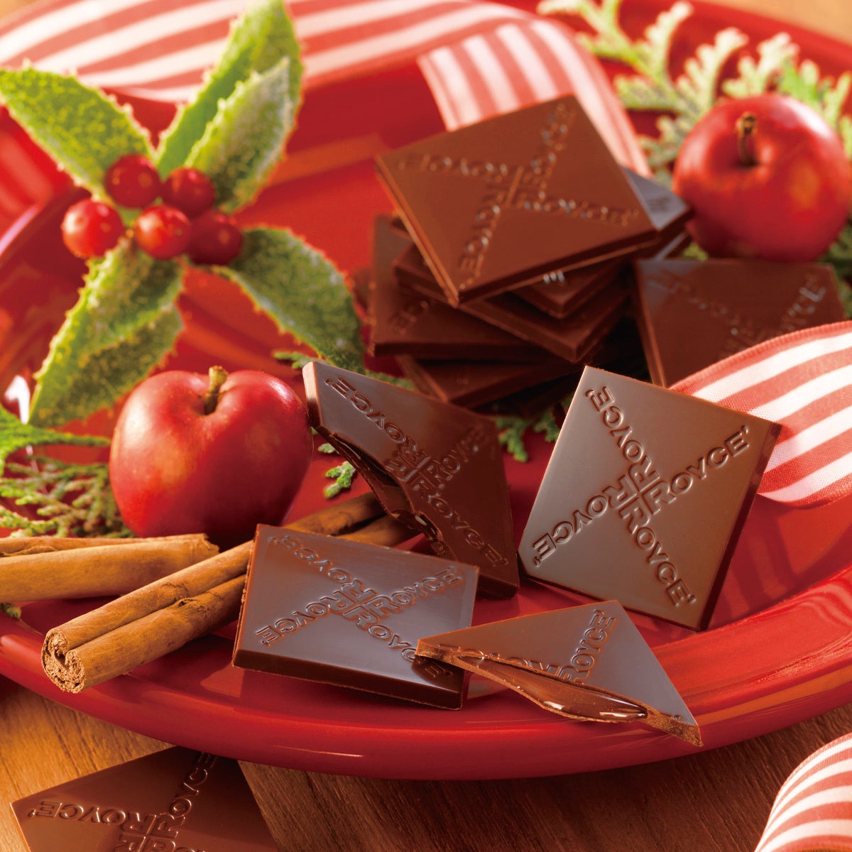 薄く繊細なチョコレートの中に、シナモンが香るとろりとしたアップルソースを閉じ込めました。口の中でぱりんと割ると、りんごのさわやかな風味、シナモンの甘い香りが、すっきりとしたチョコレートの味わいとハーモニーを奏でます。