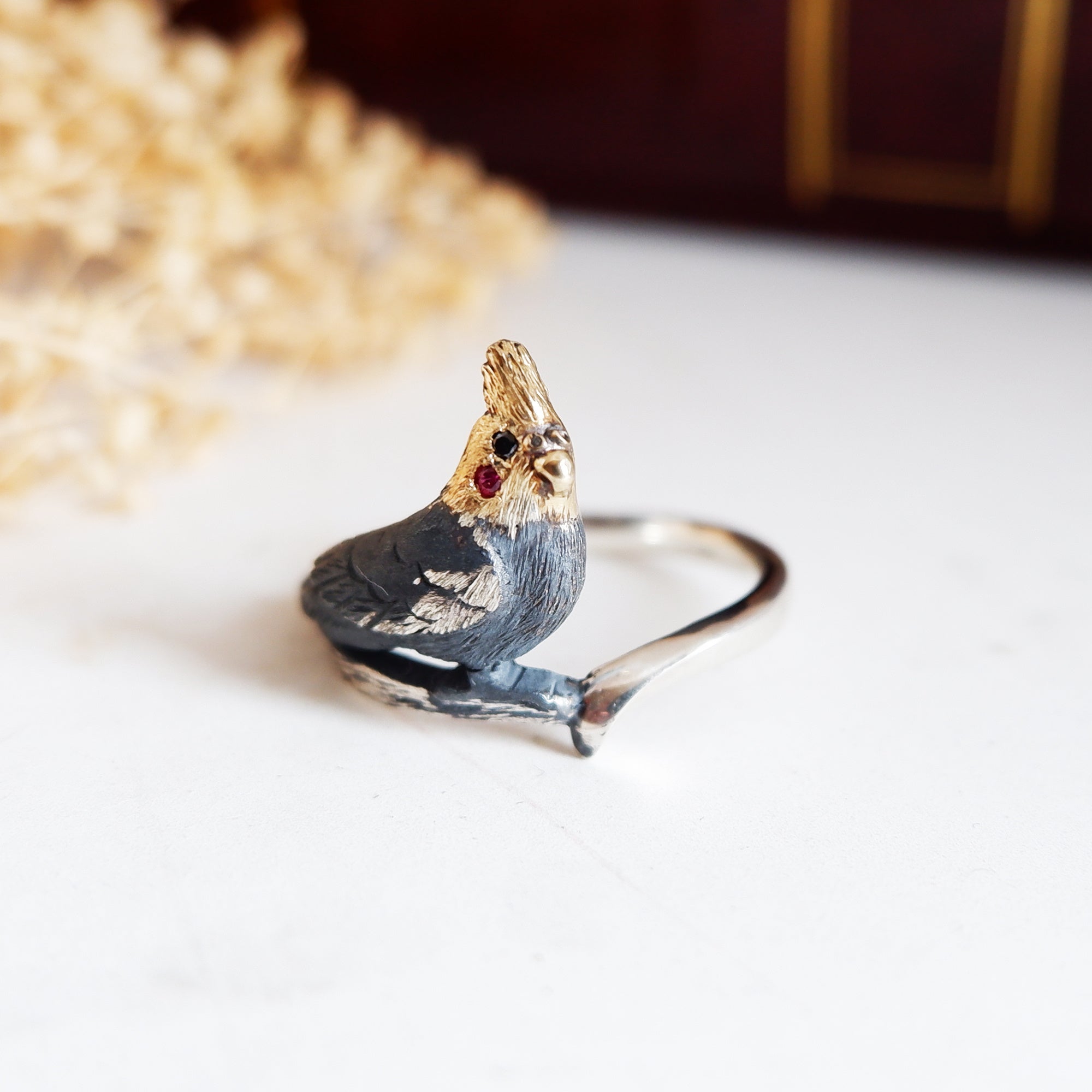 お顔がK18で体がシルバーのオカメインコのリングです。ほっぺにはルビー、目にはブラックダイヤをあしらっています。