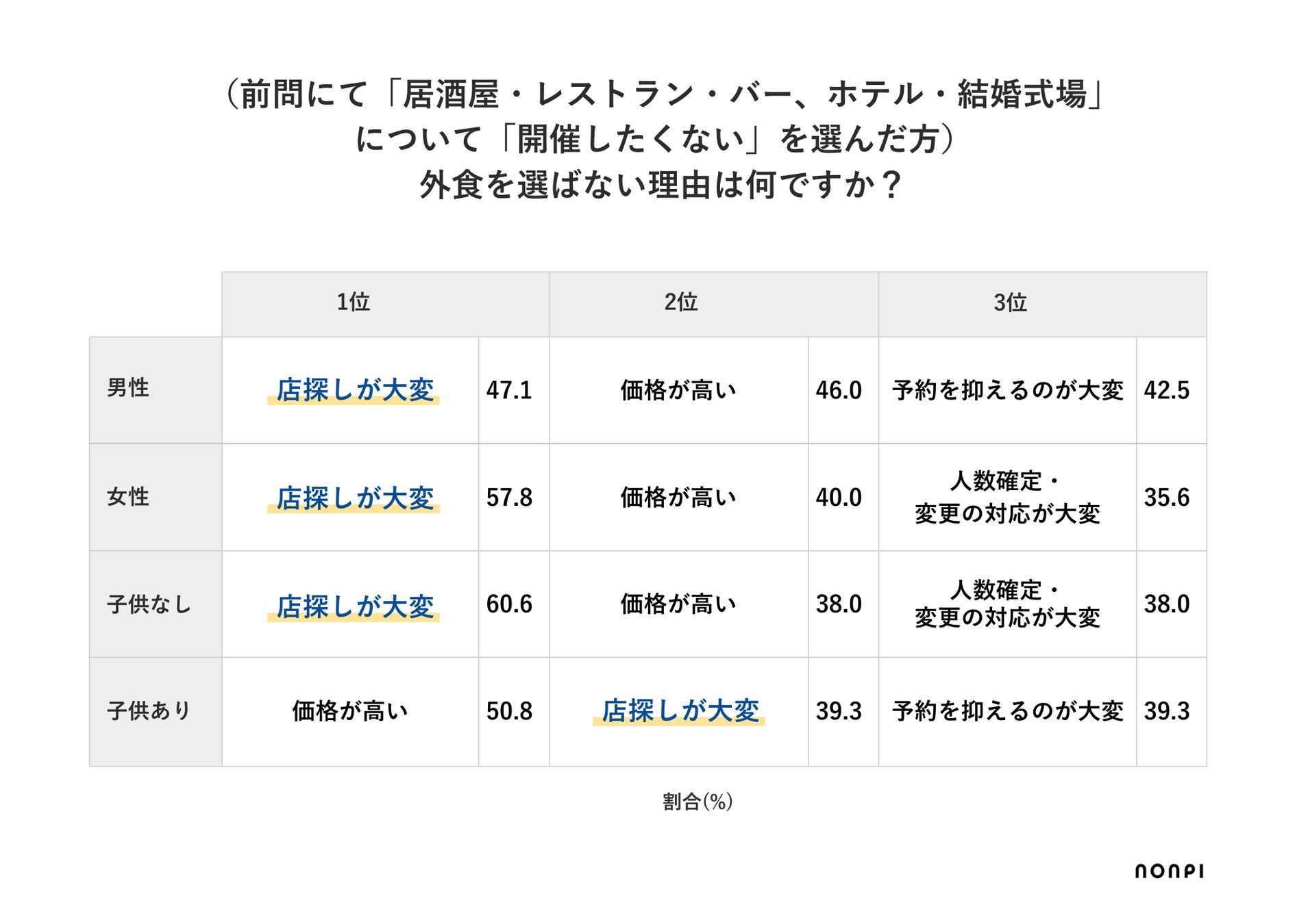 前問の「居酒屋・レストラン・バー、ホテル・結婚式場」について「開催したくない理由」を聞いたところ、「店探しが大変」が50.8%、「価格が高い」が43.9%、「予約を抑えるのが大変」が38.6%となりました。