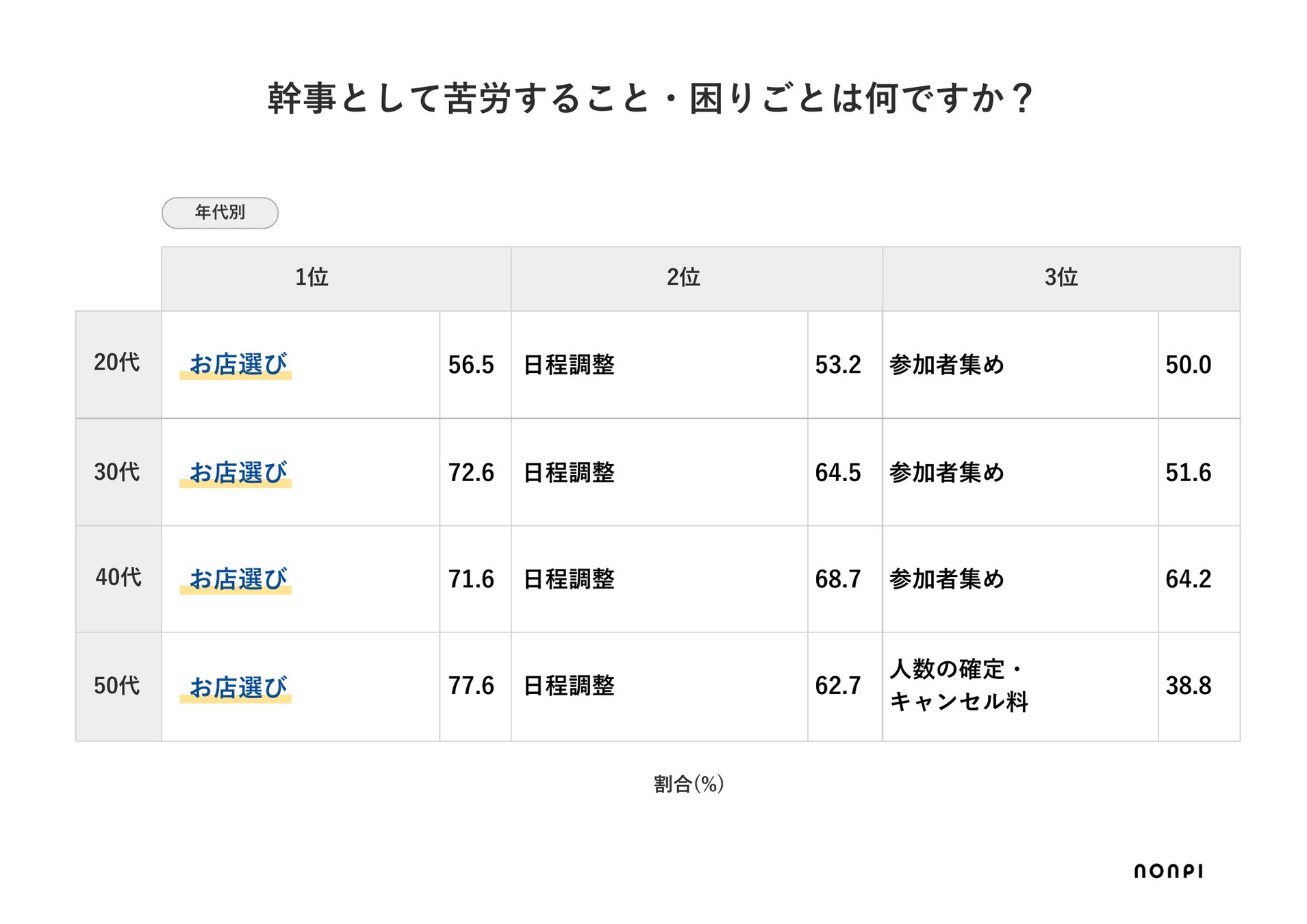 年齢別の内訳を見ると、「お店選び」は50代で77.6%(全体比+6ポイント)、「日程調整」は40代で68.7%(全体比+6ポイント)、「参加者集め」は40代で64.2%(全体比+12ポイント)となり、40~50代の“ベテラン幹事世代”は他の世代よりも負担を強く感じていることが分かりました。