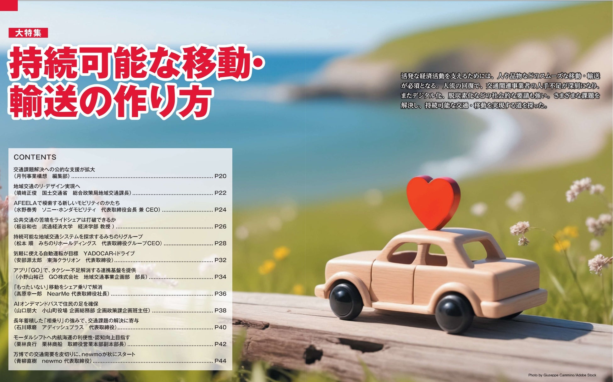 世界的な感染症の流行が終息し、人流が戻る中で浮上したのが地域の交通課題です。運行の担い手が減り、必要な移動手段が確保できない事態の発生が危惧されています。地域社会が担う移動の「リ・デザイン」に対する公的な支援が強化され、新事業の機会創出が広がるなか、大特集では「移動・輸送」をテーマに国の方針や企業の最先端技術、地域における多様な実践事例を取材しました。