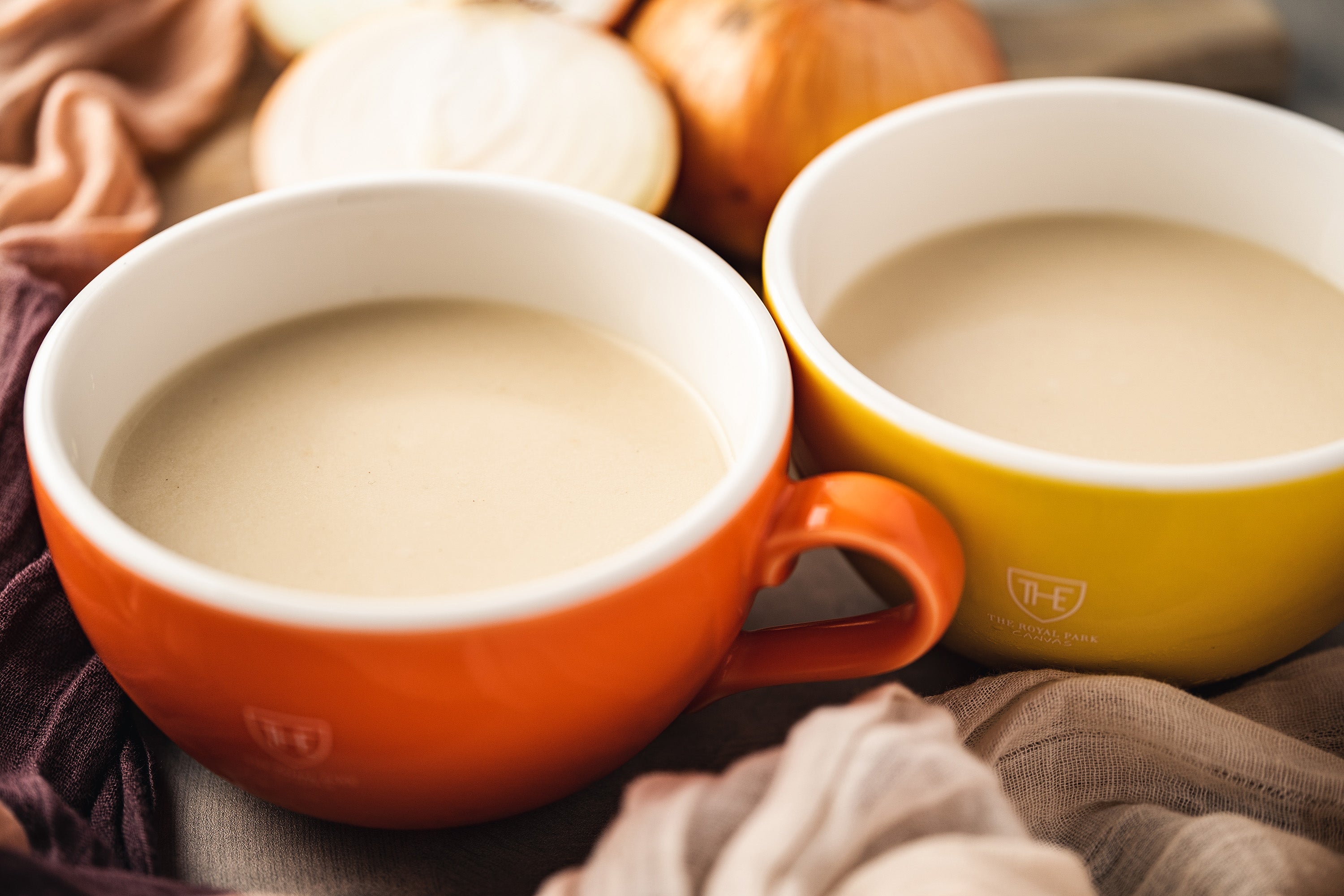 ロイヤルパークホテルズアンドリゾーツでは、髙橋 明 グループ統括総料理長監修のもと、野菜本来の甘さと旨味を活かし、野菜そのものを感じられるスープに仕上げています。標高が高く気温差の大きい八ヶ岳で育った玉ねぎを使用したクリーミーな温製スープです。生サラダでも食べられる素材の甘みをさらに引き出すため、じっくりとバターでソテーし、ブイヨンと牛乳で煮込んでいます。口に含むと広がる、玉ねぎのまろやかな味と香りをぜひお試しください。