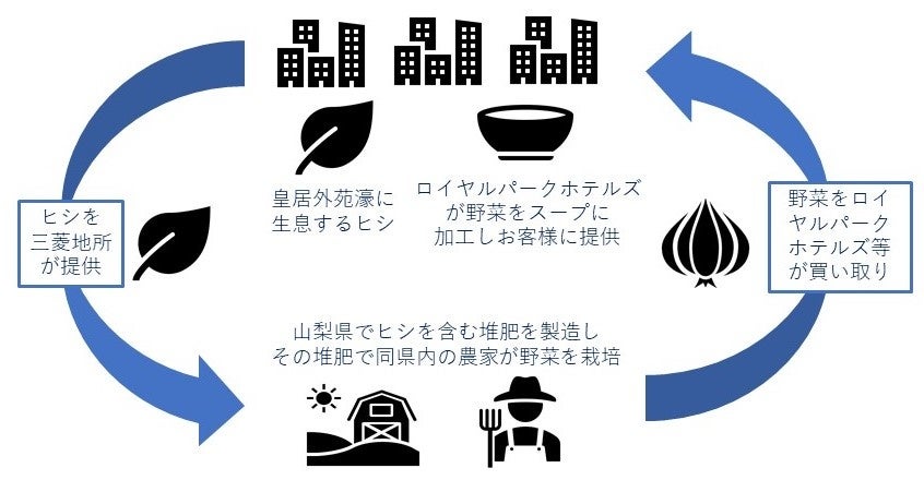 三菱地所グループは、「濠プロジェクト※1」と題して、環境省皇居外苑管理事務所と連携し、東京・丸の内の皇居外苑濠の水辺生態系の復元や生物多様性の保全を目指す取り組みを行っておりますが、2019年からは、環境省が実施する皇居外苑濠の管理(環境省実施※2)の過程で刈り取った水草「ヒシ(菱)※3」を堆肥化し、この堆肥を用いて山梨県で栽培された野菜を三菱地所本社カフェテリアやロイヤルパークホテルズにおいて食材として活用するという、都市と地方をつなぐ資源循環の仕組みを構築しています。