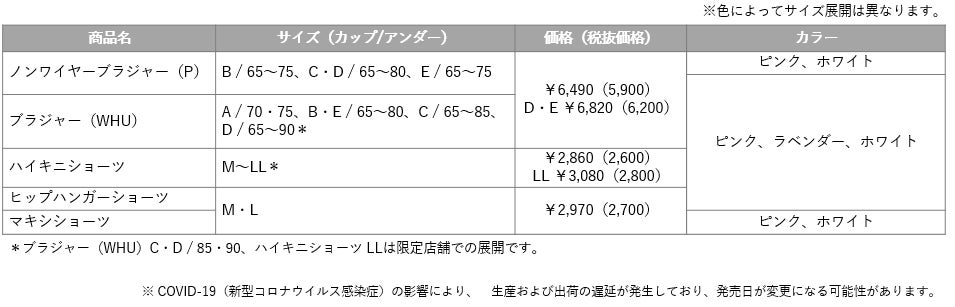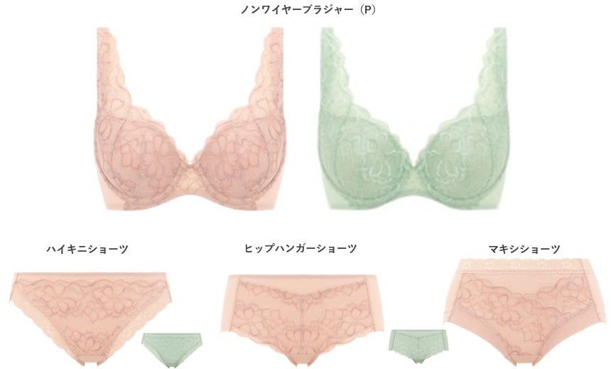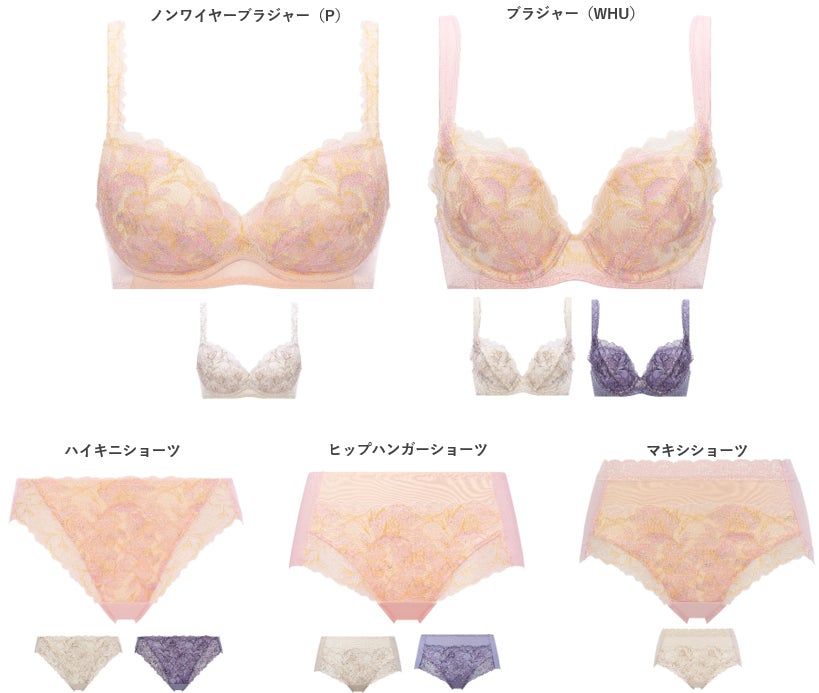 ノンワイヤーブラジャー(P)は、左右が繋がったカップ形状と肌側のサポート布で、ノンワイヤーながらもきれいなルエット。ブラジャー(WHU)はワイヤー入りながら、ラクちん&ナチュラルにバストアップします。