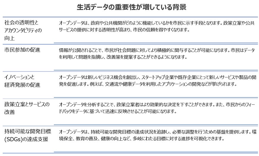 これらの特性により、生活分野のオープンデータは市民生活の質の向上、より良い政策の形成、イノベーションの促進など、多方面にわたる利点を提供しています。