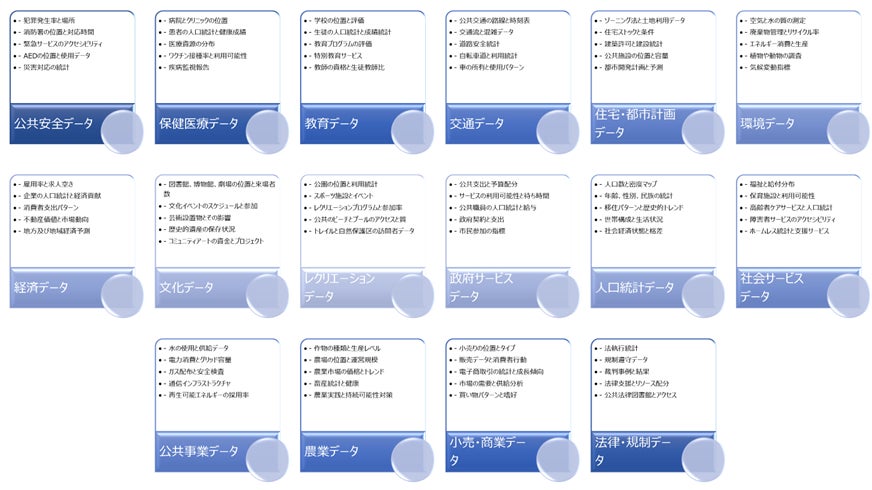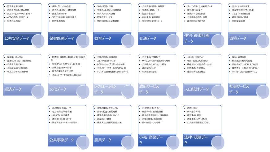 これらのデータカテゴリーは、政策立案、透明性の向上、イノベーションの促進、市民がより情報に基づいた選択を行えるよう支援するための貴重な情報源として機能しています。各データセットは、生活の質を改善し、社会発展を進めるための洞察を提供します。