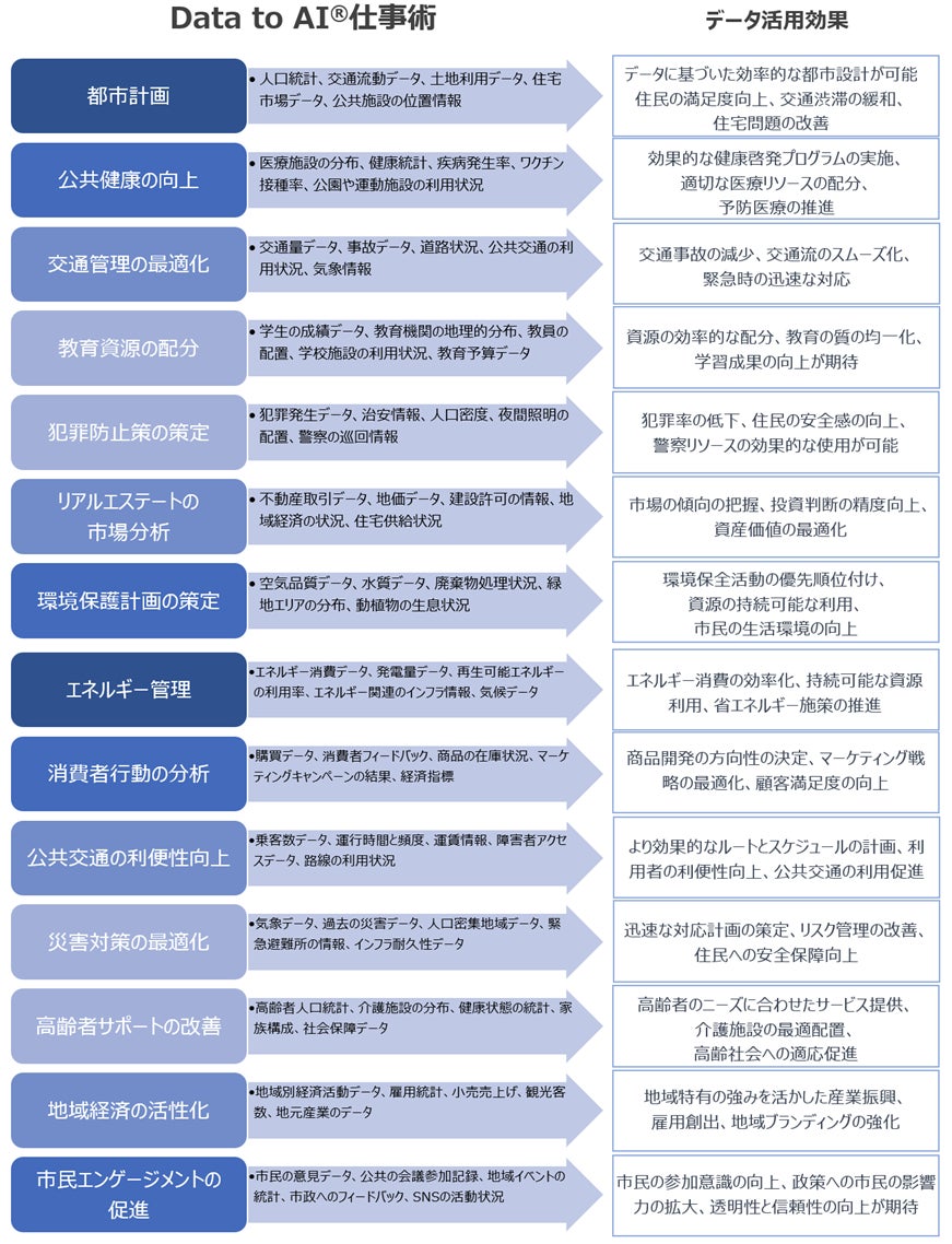 - 使用データ:市民の意見データ、公共の会議参加記録、地域イベントの統計、市政へのフィードバック、SNSの活動状況