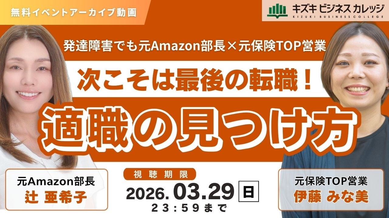 就労移行支援事業所・キズキビジネスカレッジ(KBC)は、発達障害の当事者で元Amazon部長の辻と適職発見のプロの伊藤が、適職の見つけ方について語る対談イベントのアーカイブ動画を配信いたします。