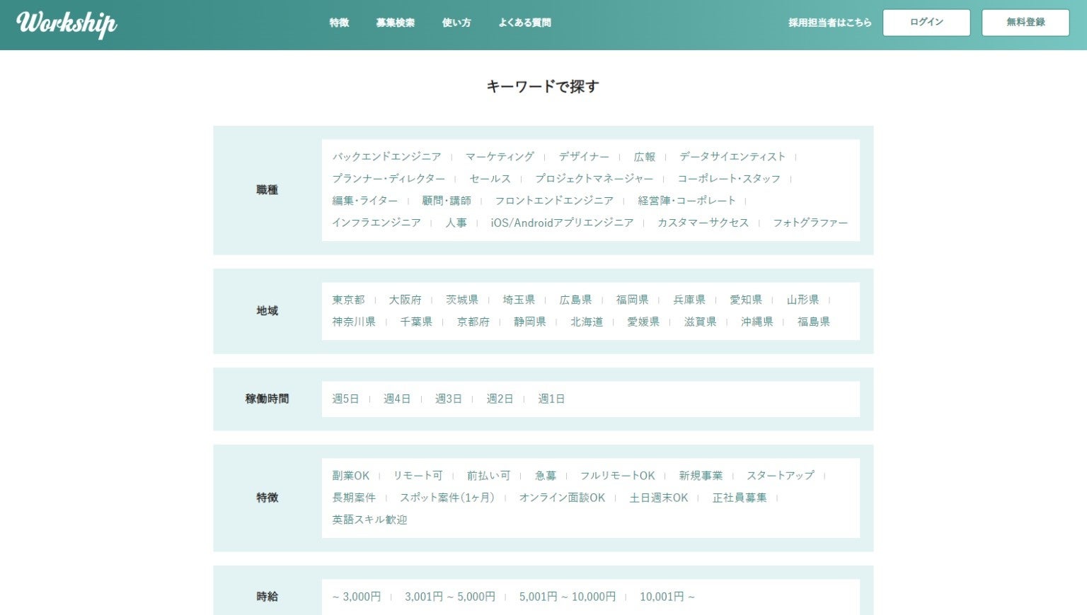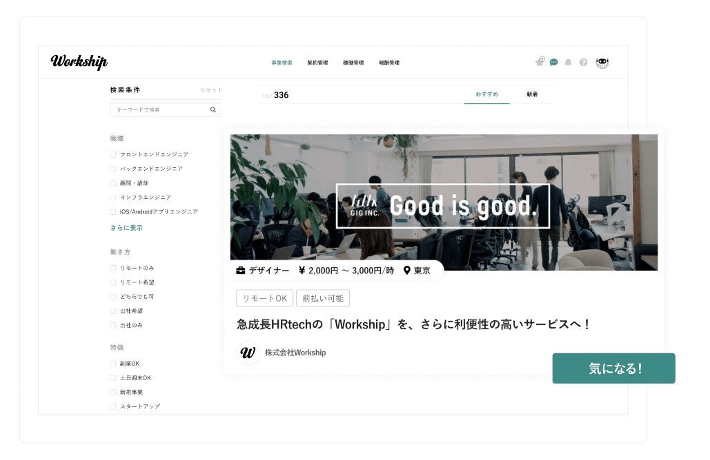 多くの企業の中からスムーズに仕事が探せるよう、Workshipではさまざまな絞り込み条件を設けています。