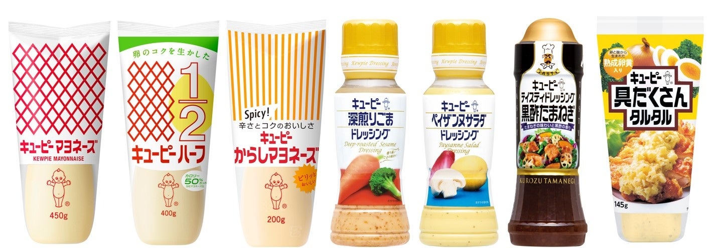 キユーピー マヨネーズ(200g以上)、キユーピーハーフ、キユーピーライト、キユーピーゼロ ノンコレステロール、キユーピー ディフェ、キユーピー アマニ油マヨネーズ、キユーピー フィッテ、キユーピー エッグケア(卵不使用)、キユーピー からしマヨネーズ、キユーピー 燻製マヨネーズ、キユーピー ドレッシング全品※2、パン工房、キユーピー タルタルソース、キユーピー 具だくさんタルタル、キユーピー マスタード※3
