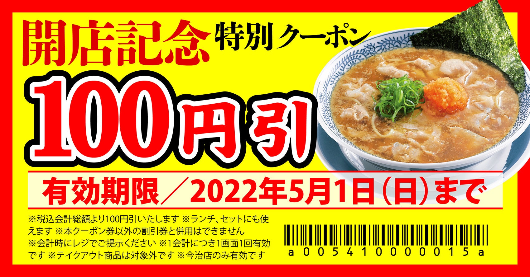 株式会社物語コーポレーション(本社:愛知県豊橋市/代表取締役社長:加藤 央之)が運営する『丸源ラーメン』は、2022年4月21日(木)に、全国179店舗目となる『丸源ラーメン 今治店』(愛媛県今治市)をグランドオープンいたします。オープン記念として、2022年5⽉1⽇(日)まで『丸源ラーメン 今治店』のみでご利⽤いただける100円引クーポンを配布します。