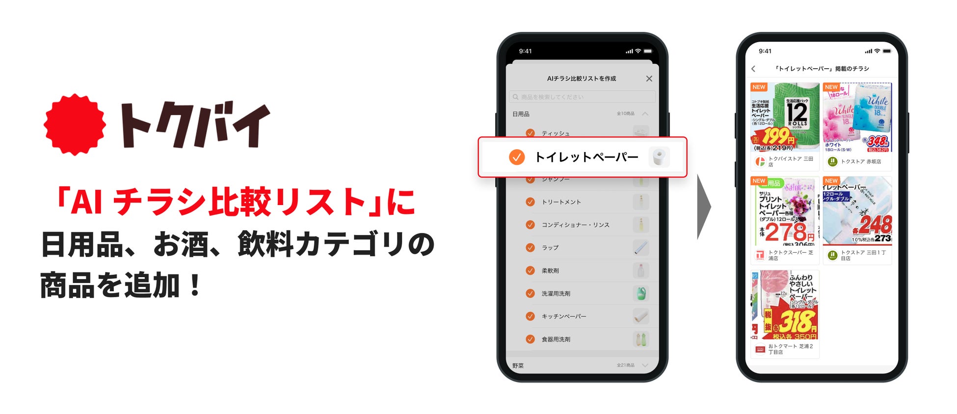 トクバイアプリの「AI チラシ比較リスト」、ユーザーのリクエストに応えて「日用品」「お酒」「飲料」カテゴリの商品を追加!