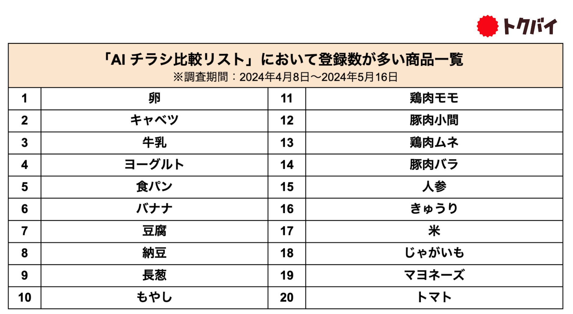 2024年4月の「AI チラシ比較リスト」リリース以降、ユーザーがリストに登録し、比較している商品について調査したところ、最も多く比較されていた商品は「卵」でした。次いで、「キャベツ」「牛乳」「ヨーグルト」「食パン」などが続きました。価格高騰が話題となっている食材や、日常生活の必需品などがよく比較されていることがわかります。