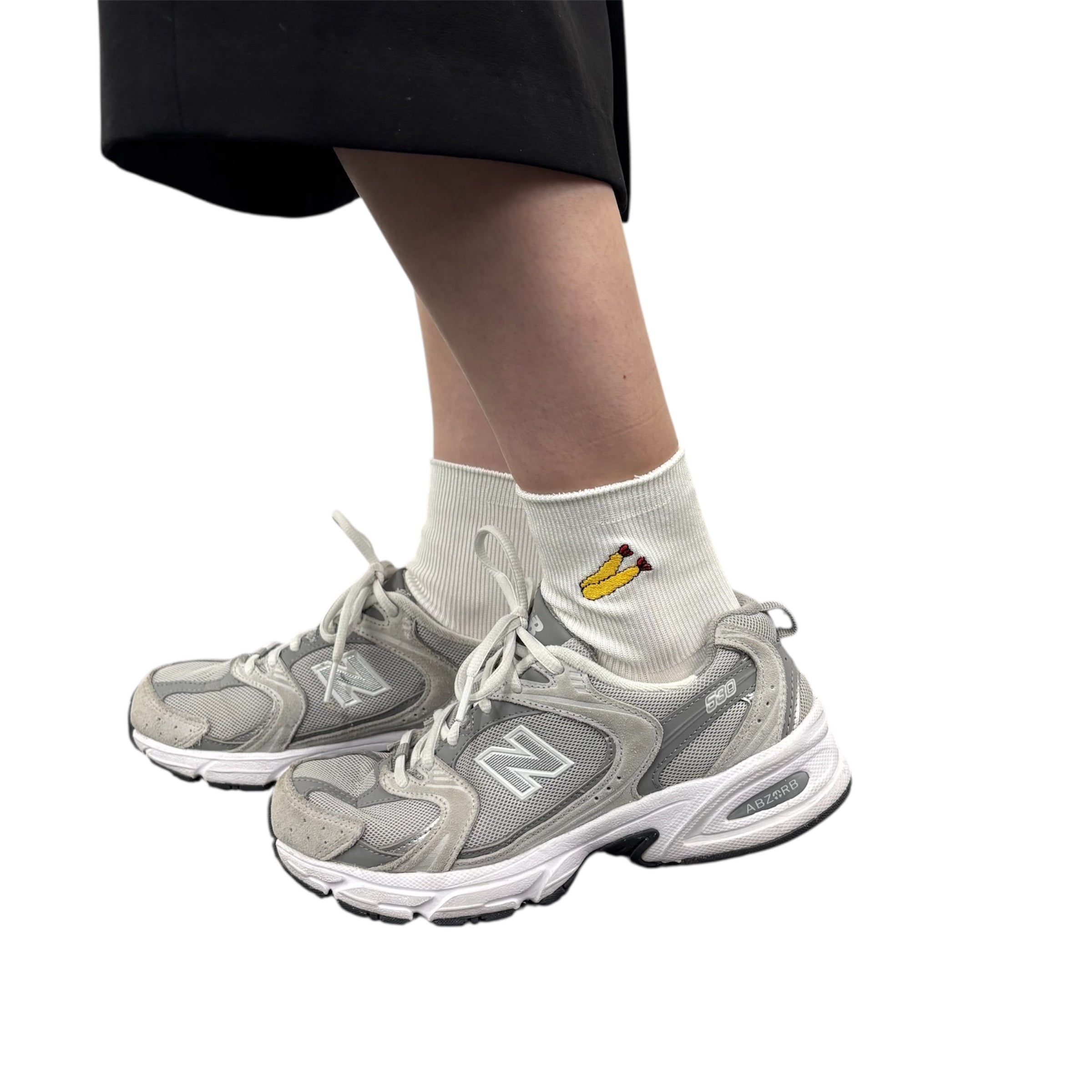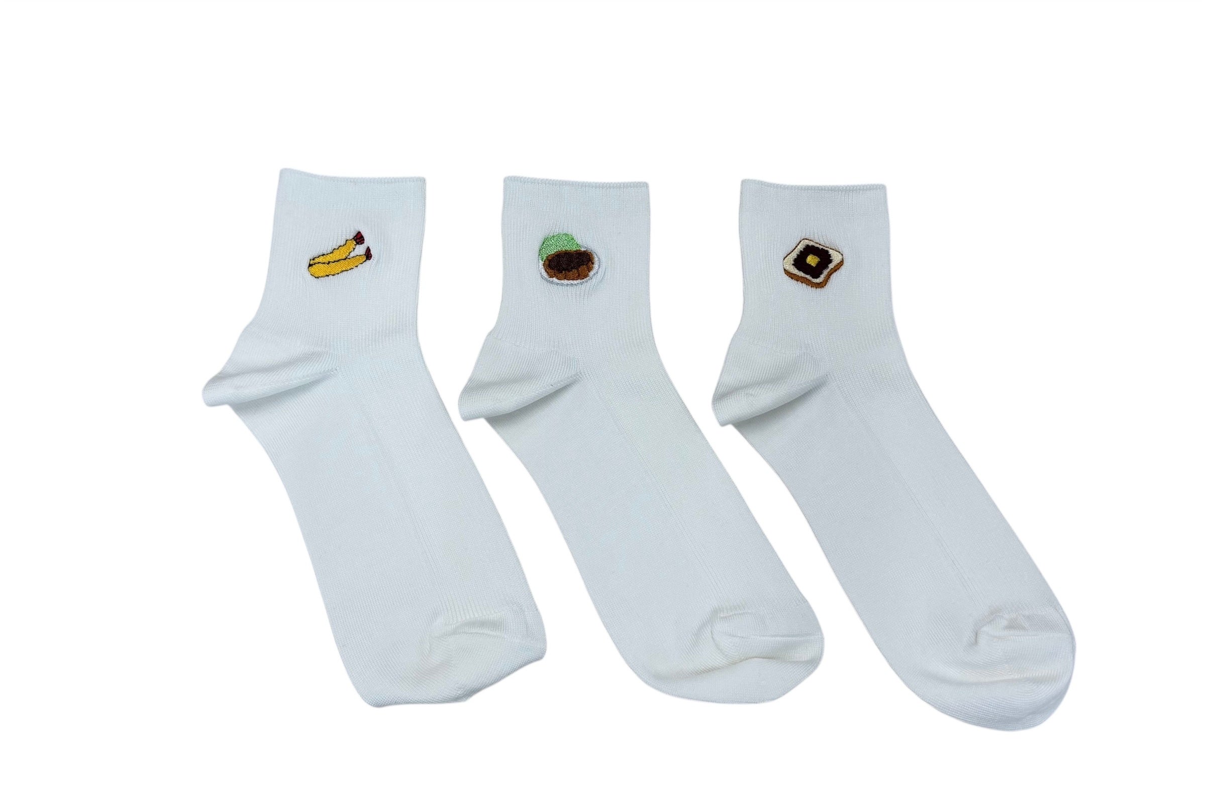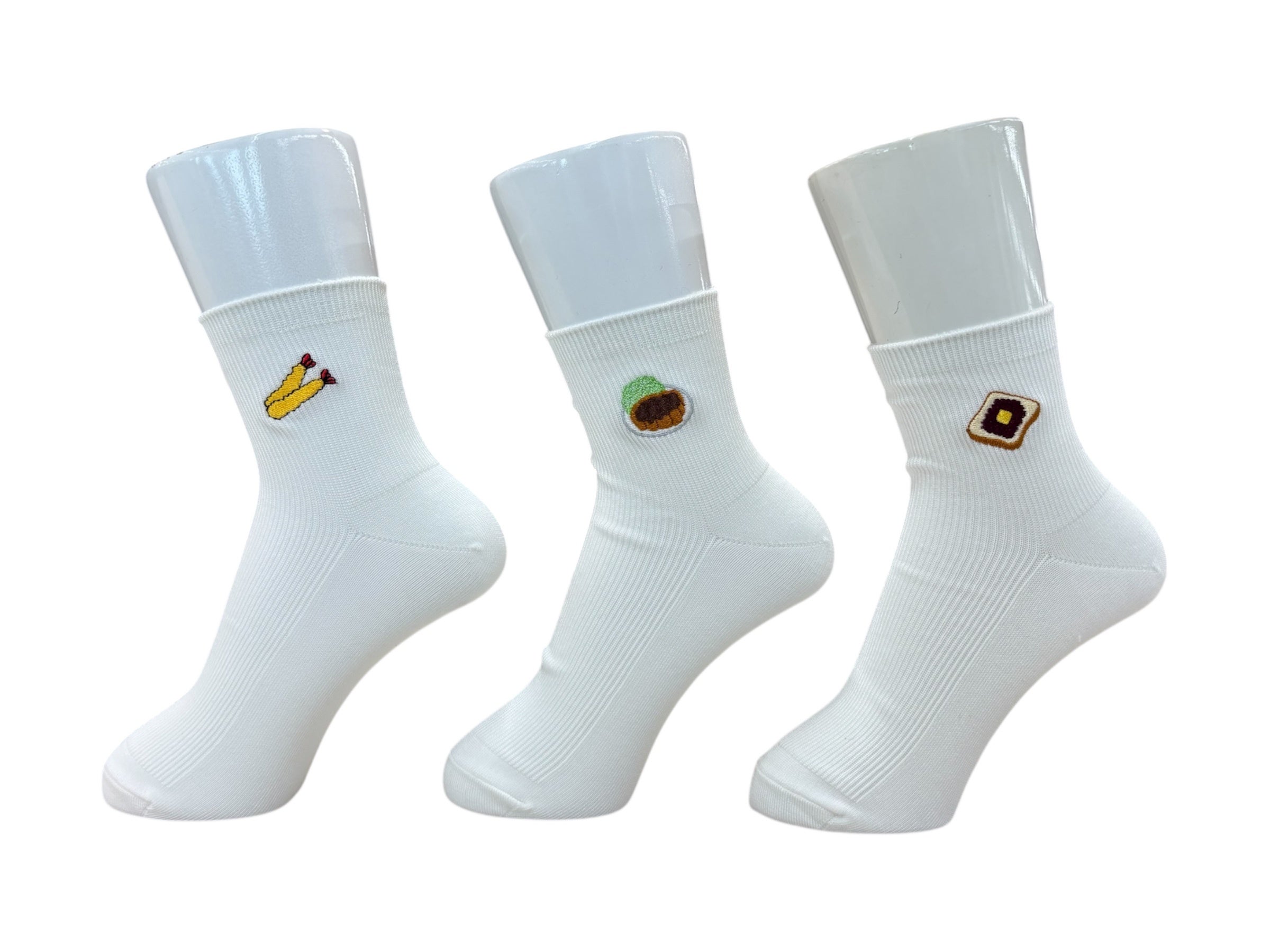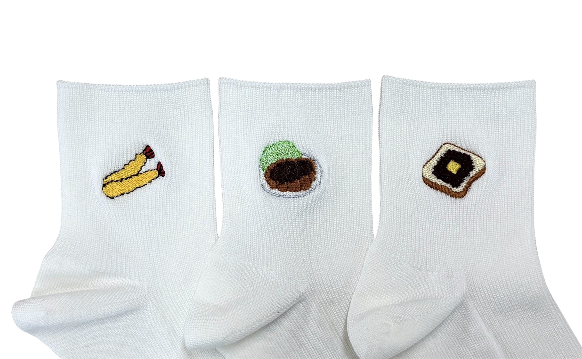 「小倉トースト」「鉄板ナポリタン」「ひつまぶし」をあしらったプリントタイプと、「エビフライ」「みそかつ」「小倉トースト」の刺繍タイプの靴下が登場します。プリントタイプは、リアルな絵柄が他にはないインパクトを、刺繍タイプはかわいらしさもありワンポイントなので普段履きとしても履きやすい1足です。自分用にはもちろんですが、旅の土産にもぴったりな靴下です。ポップアップショップ終了後は、4階 ランジェリー&リラクシング <タビオ>店舗で名古屋地区百貨店当店限定で販売いたします。