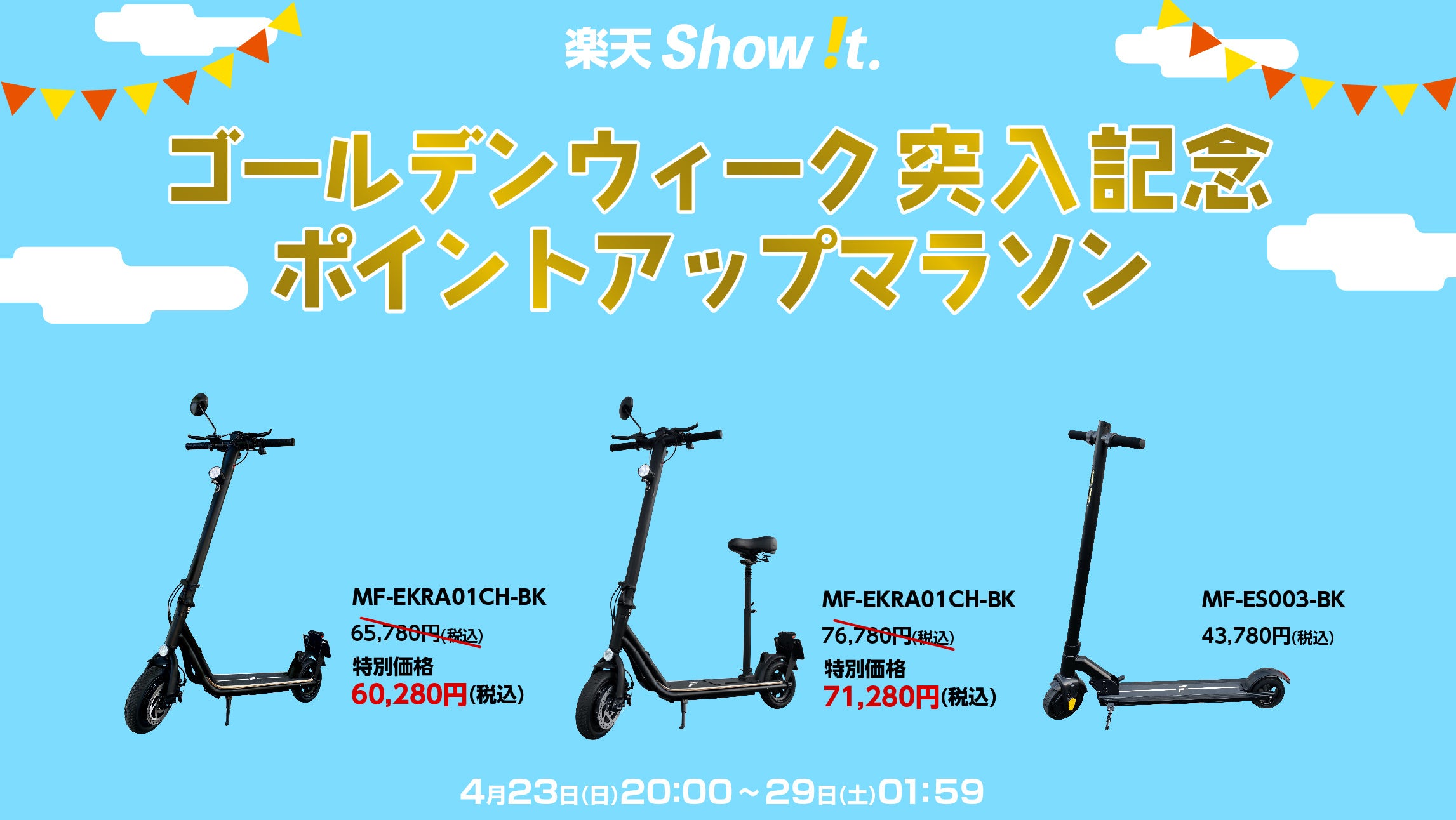 楽天「Show !t」レジャーにおすすめ、公道走行対応電動キックボードの5,000円オフセールを開催。さらに4月23日20時スタート全商品ポイント10倍、楽天お買い物マラソンに参加。