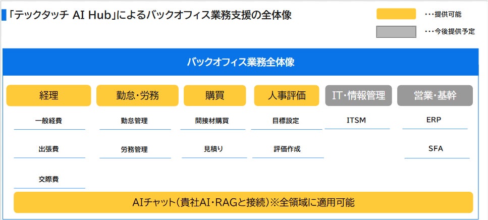 「業務代行AIエージェント」は、まずは経費精算や勤怠管理、間接材購買といったバックオフィスの主要業務からスタートし、今後は情報管理や営業など幅広い業務領域へと拡大していく予定です。各業務において、従来は人が行っていた入力・確認・判断・処理のプロセスをAIが支援・自動化することで、企業は日常業務の自動化レベルを段階的に高められます。テックタッチは、「使われるAI」から「業務そのものを実行するAI(業務代行AI)」へと発展し、企業の生産性向上と内部統制強化を同時に実現する未来を目指します。