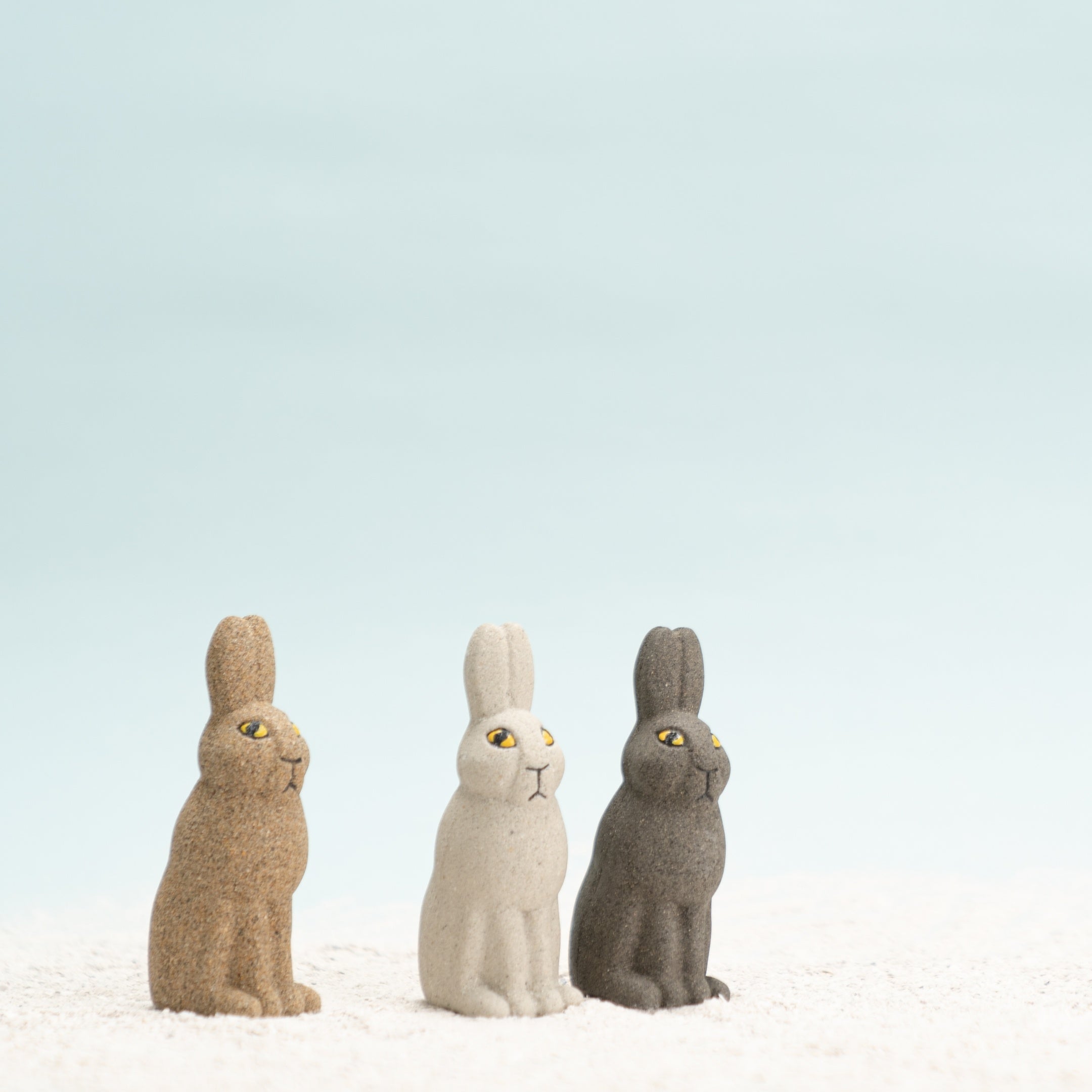 鳥取砂丘エリアの砂をリユースした「とっとりのらくだ」と同じ原料で作られています。砂の向こうにはきっとオアシスがあるから「旅のうさぎ」は旅に出ていく。その後を海と情熱のうさぎが追いかけていく。そんなイメージで作りました。