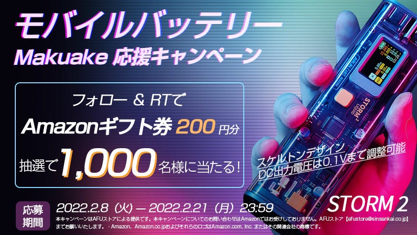 鑫三海株式会社(本社:大阪府堺市堺区、代表取締役:伴場 義通)は、Amazonギフト券がフォロー&RTで1,000名様に抽選で当たる、モバイルバッテリー「STORM2」のラストキャンペーンを、AFUストアのTwitter公式アカウントで2月8日に開催しました。