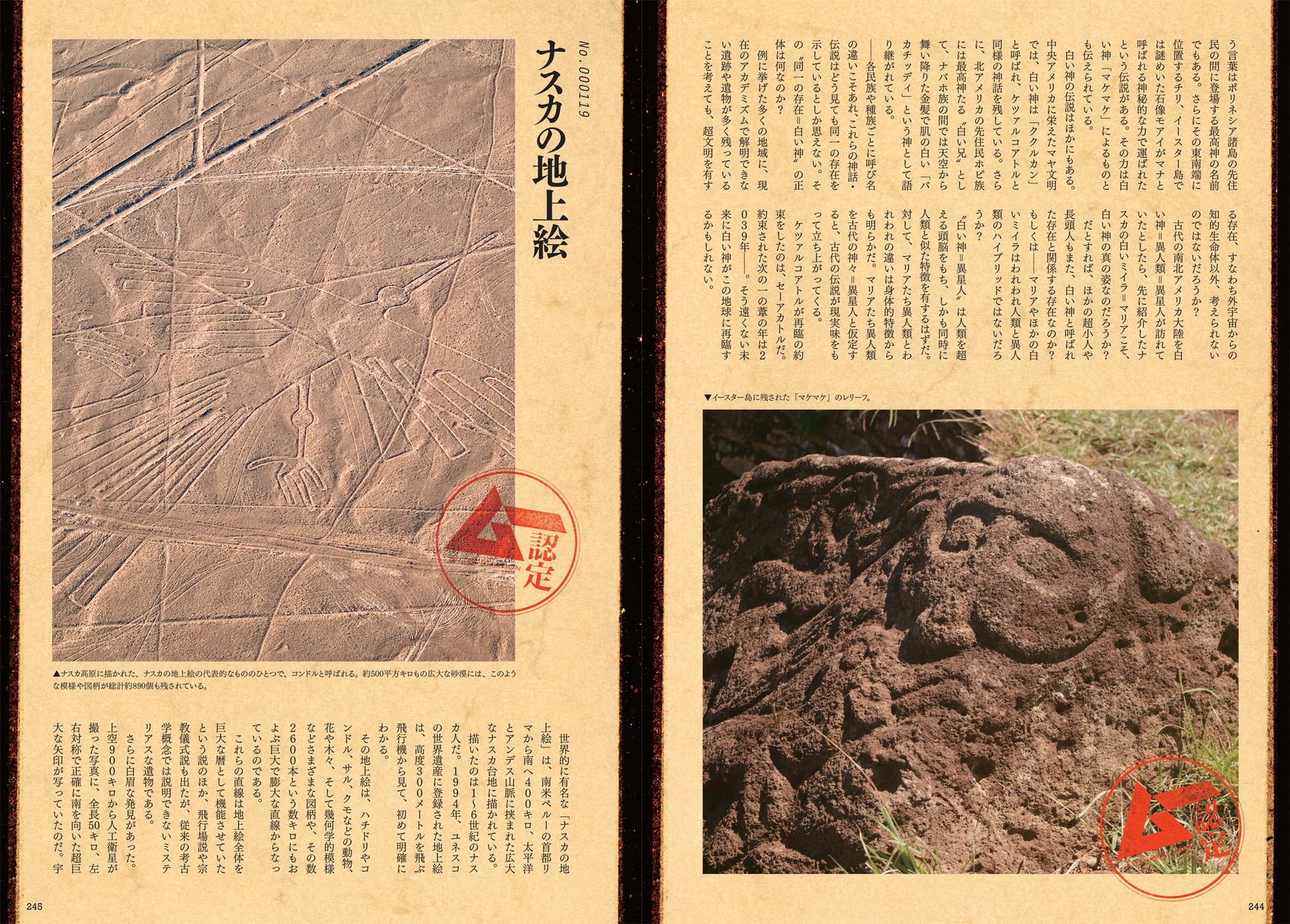 もっとも有名なUFO事件である「ロズウェル事件」や江戸時代のUFO漂着事件である「虚船」から、ミステリーサークル、バミューダ・トライアングルといった定番の超常現象事件を最新の見解で紹介している『ムー認定 驚異の超常現象』と、「水晶ドクロ」をはじめとしたオーパーツ群からエジプトから中南米、南極にまで分布するピラミッド群、ムーやアトランティスといった超古代文明に、ナスカの地上絵と異人類ミイラなどの歴史ロマンを詰め込んだ『ムー認定 神秘の古代遺産』。