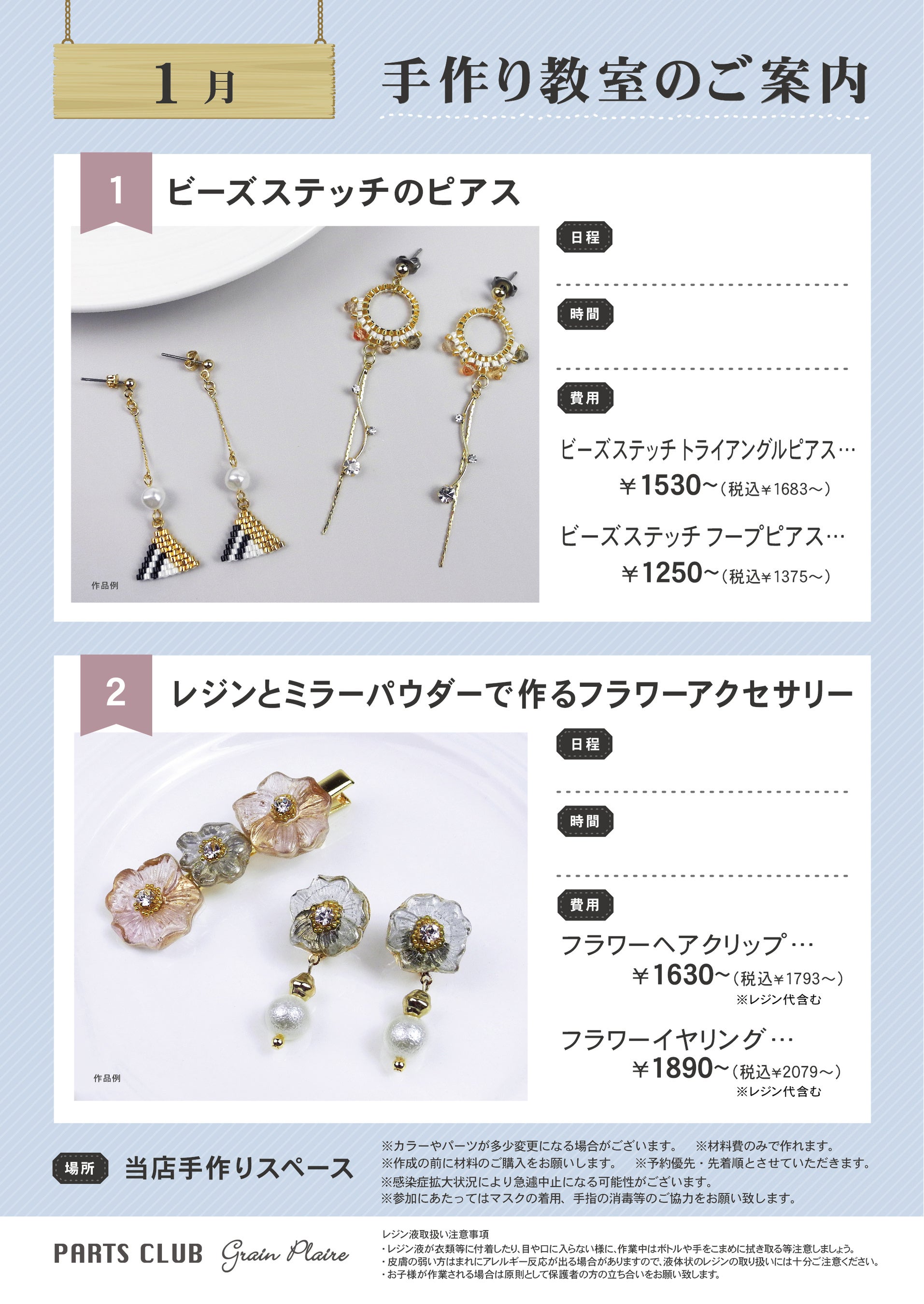 ビーズ&アクセサリーパーツショップPARTS CLUB。材料費だけで参加できる「手作り教室」1月の内容はビーズステッチで作るピアスとレジンを使ったフラワーアクセサリー。