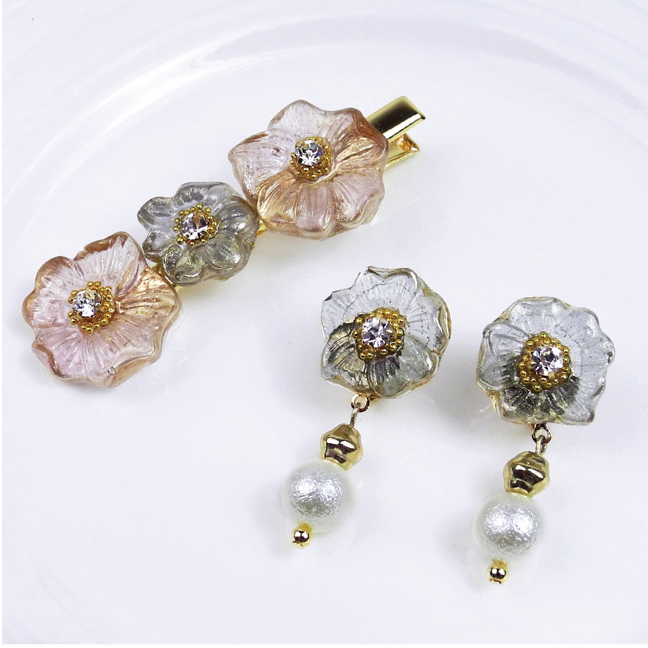 レジンとミラーパウダーを使い、透明感のあるビンテージ風のフラワーイヤリングを作ります。