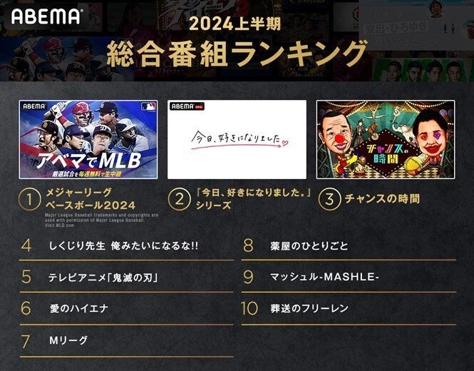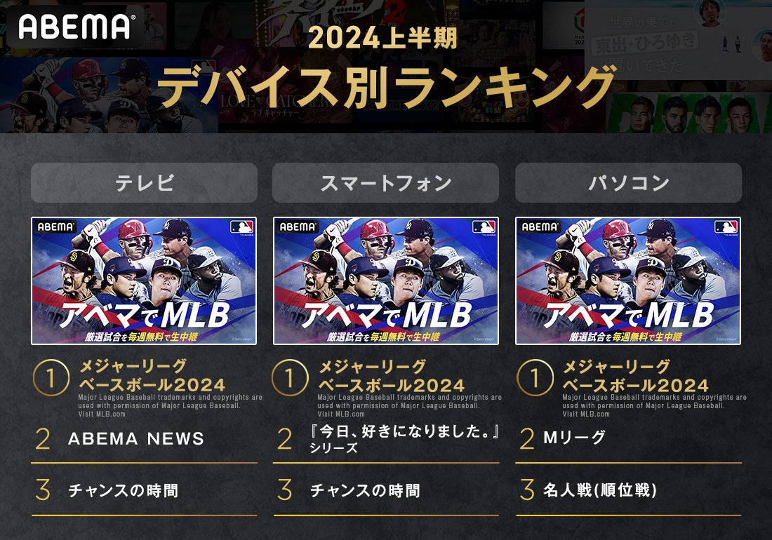 新しい未来のテレビ「ABEMA」が2024年上半期の人気番組ランキングを発表 『MLB』が首位に、大谷翔平選手らの活躍を日本中が「ABEMA」で目撃!