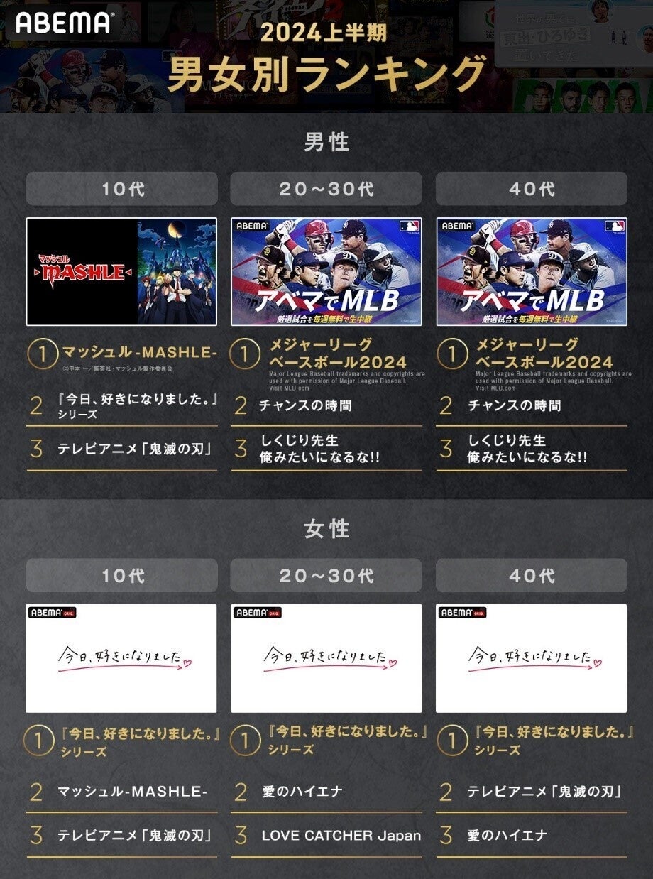 ここでは「ABEMA」を利用している視聴者のデモグラフィック情報を基にした男女の年代別の2024年上半期人気番組ランキングを発表いたします。