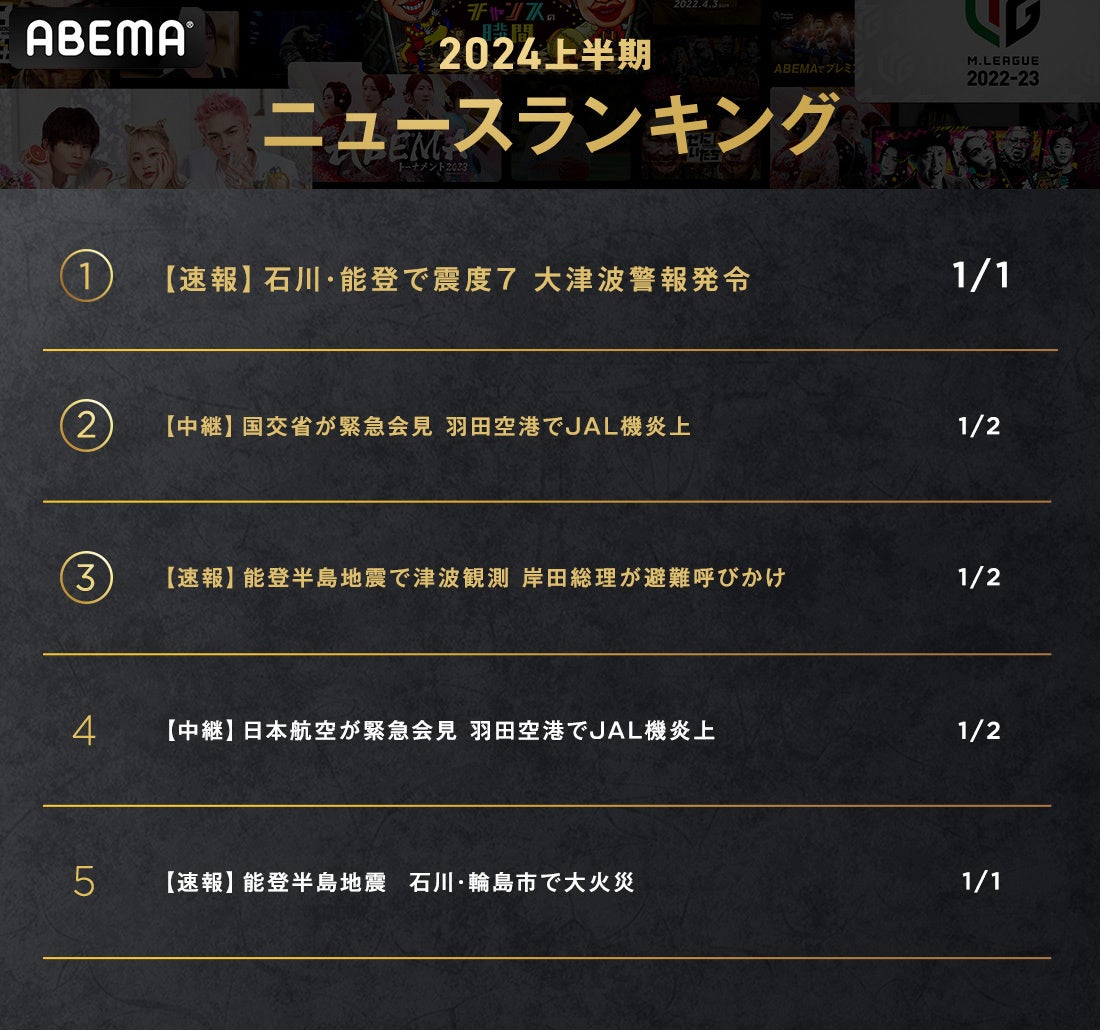 ■2024年上半期ニュースランキング、年明けに相次いだ災害や事故のニュースを多くの視聴者が「ABEMA NEWSチャンネル」で視聴