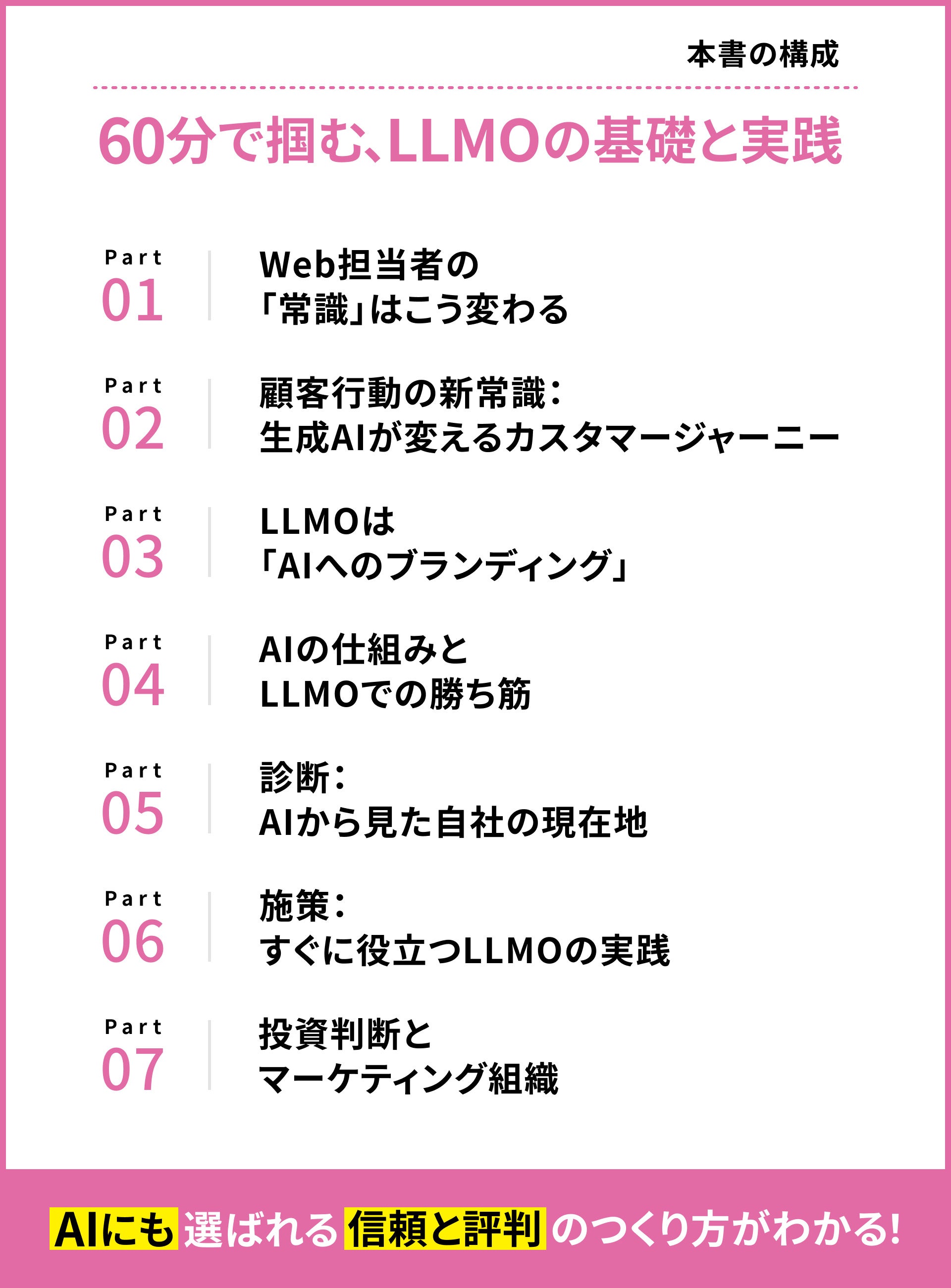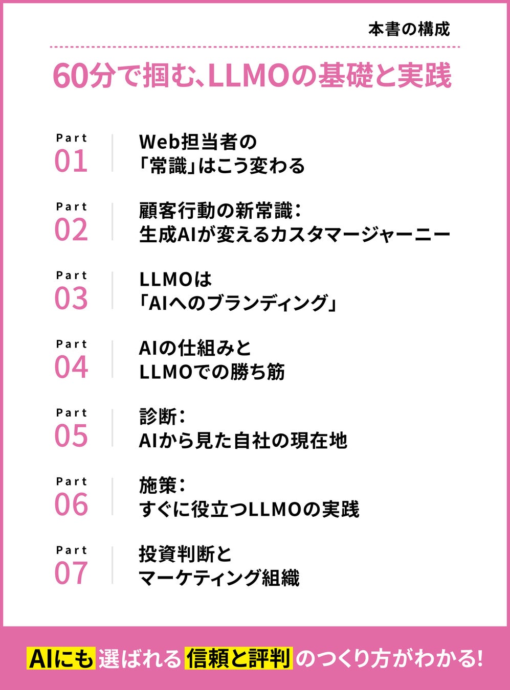 本書では、LLMOの基礎から、AIに選ばれるための情報発信のポイントや自社の現在地を把握するための診断方法など、実践に直結する進め方まで整理しています。