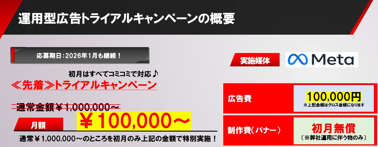 売れるネット広告社グループ株式会社(本社:福岡県福岡市、代表取締役社長 CEO:植木原宗平、東証グロース市場:証券コード9235、以下 売れるネット広告社グループ)の連結子会社である売れるネット広告社株式会社は、2025年12月まで実施していた「運用型広告トライアルキャンペーン」(月間10万円から開始できる運用型広告支援)について、反響を受け、2026年1月も継続することをお知らせいたします。