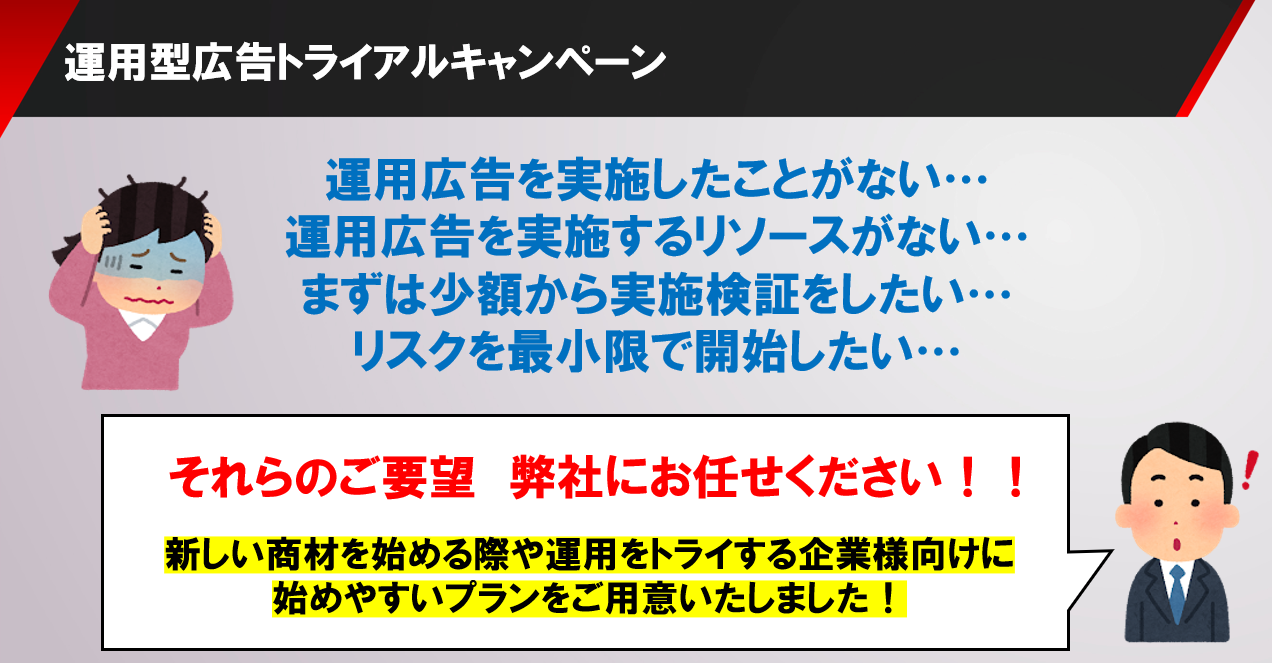 近年、広告運用においては「新商材の立ち上げ前に、小額で数値の出方を確認したい」「運用型広告が自社商材に適合するか、まずは検証したい」といった、導入前の検証ニーズが高まっています。