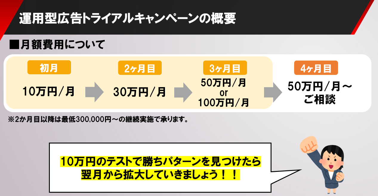 トライアル期間に得られた数値・学習(訴求軸、クリエイティブ傾向、媒体適性、ターゲット反応)を整理し、勝ち要素を再現できる状態にしたうえで、配信量と成果の両立を目指す設計へ段階的に移行してまいります。