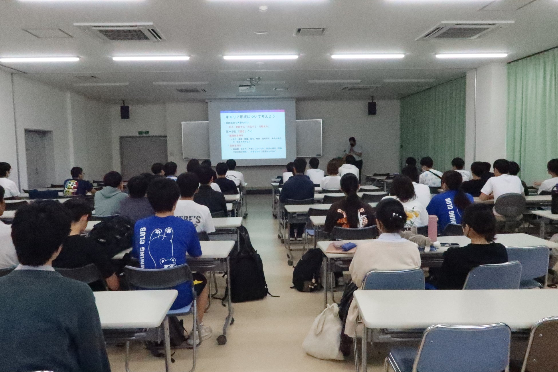 最初に、キャリア支援室長の白石准教授から、進路選択で大事なのは「知る・判断する・決定する・行動する」ことであり、その第一歩は「知る(進路先を知る、自分を知る)」ことであるとの話がありました。続いてインターンについての基本的な心構え等についての説明がありました。