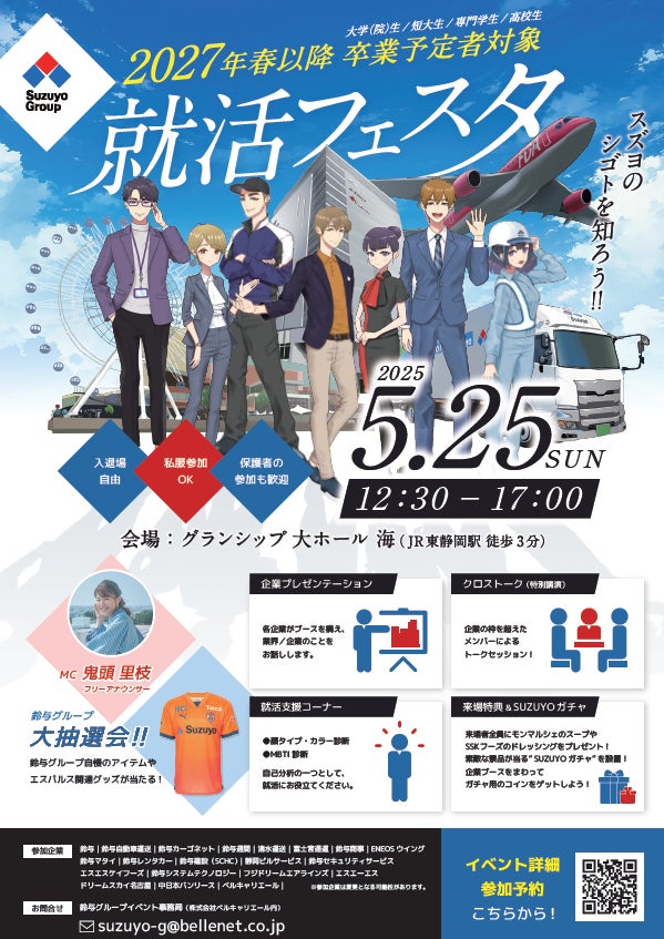 当日は、各社による会社説明会や現場社員によるパネルディスカッション、パーソナルカラー診断などを設置し、鈴与グループの事業内容とその幅広さ、各社の魅力などをより深く知っていただくことができる場となっています。来場者プレゼントをご用意しているほか、清水エスパルスのサイン入りグッズなど鈴与グループ各社提供の賞品が当たる抽選会も実施予定。また、イベントMCとして、静岡県を中心に活躍されているフリーアナウンサー 鬼頭 里枝さんをお招きします。