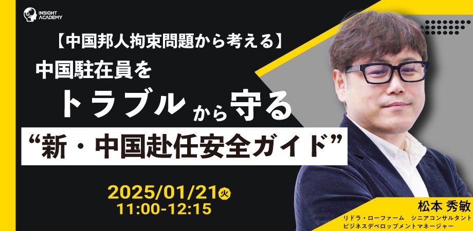 グローバル⼈材育成・研修業を⼿掛けるインサイトアカデミー株式会社(本社:東京都港区新橋、代表:金 珍燮)は、無料webセミナー「【中国駐在員をトラブルから守る】 新・中国赴任安全ガイド」を2025年1月21日(火)11:00より開催します。