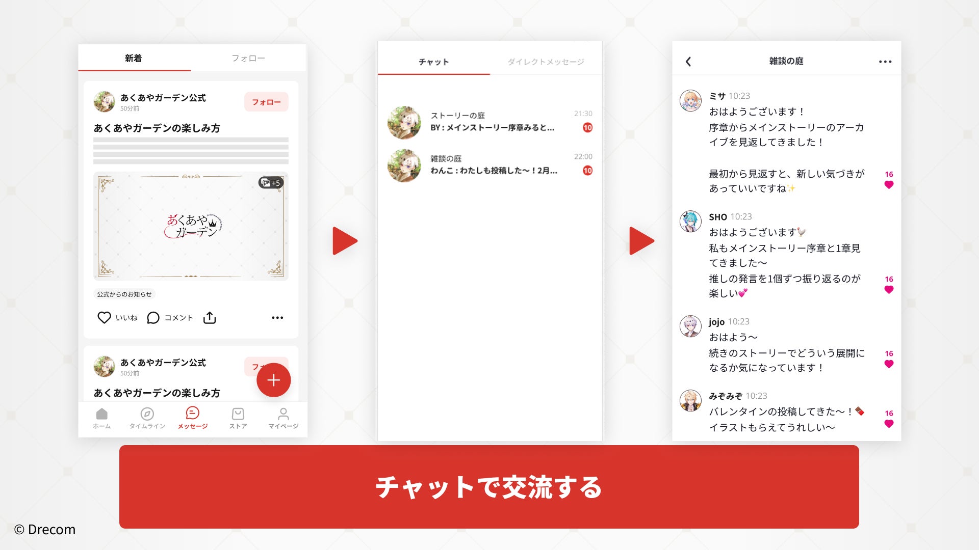公式コミュニティ正式オープンを機に、機能として「チャット」が追加されました。「チャット」は「雑談の庭」と「ストーリーの庭」の2つのチャットルームが存在し、他のコミュニティユーザーと挨拶や雑談をするなど、メッセージを送り合うことができます。また「チャット」機能追加に伴い、機能「ストーリー」に、メインストーリーの序章と第一章を追加しておりますので、初めての方もそうでない方もメインストーリーをご覧いただき、チャットルーム「ストーリーの庭」で盛り上がっていただければと思います。