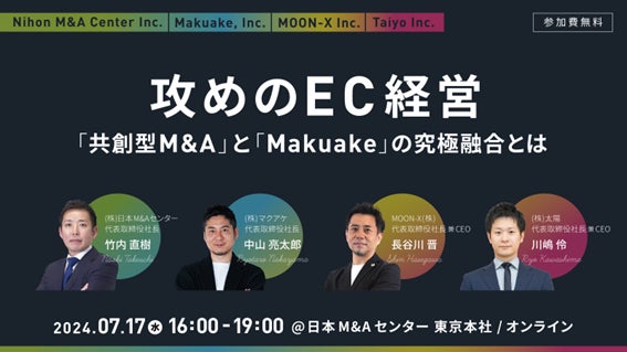 株式会社日本M&Aセンターホールディングス(以下、当社 / 本社:東京都千代田区 / 代表取締役社長:三宅 卓)の連結子会社である株式会社日本M&Aセンター(以下、日本M&Aセンター / 本社:東京都千代田区 / 代表取締役社長:竹内 直樹)は、EC事業者向けセミナー「攻めのEC経営:共創型M&AとMakuakeの究極融合とは」(共催:MOON-X株式会社、株式会社マクアケ)を7月17日(水)に都内で開催いたします。